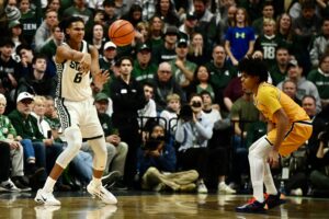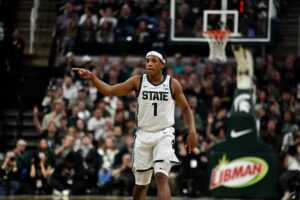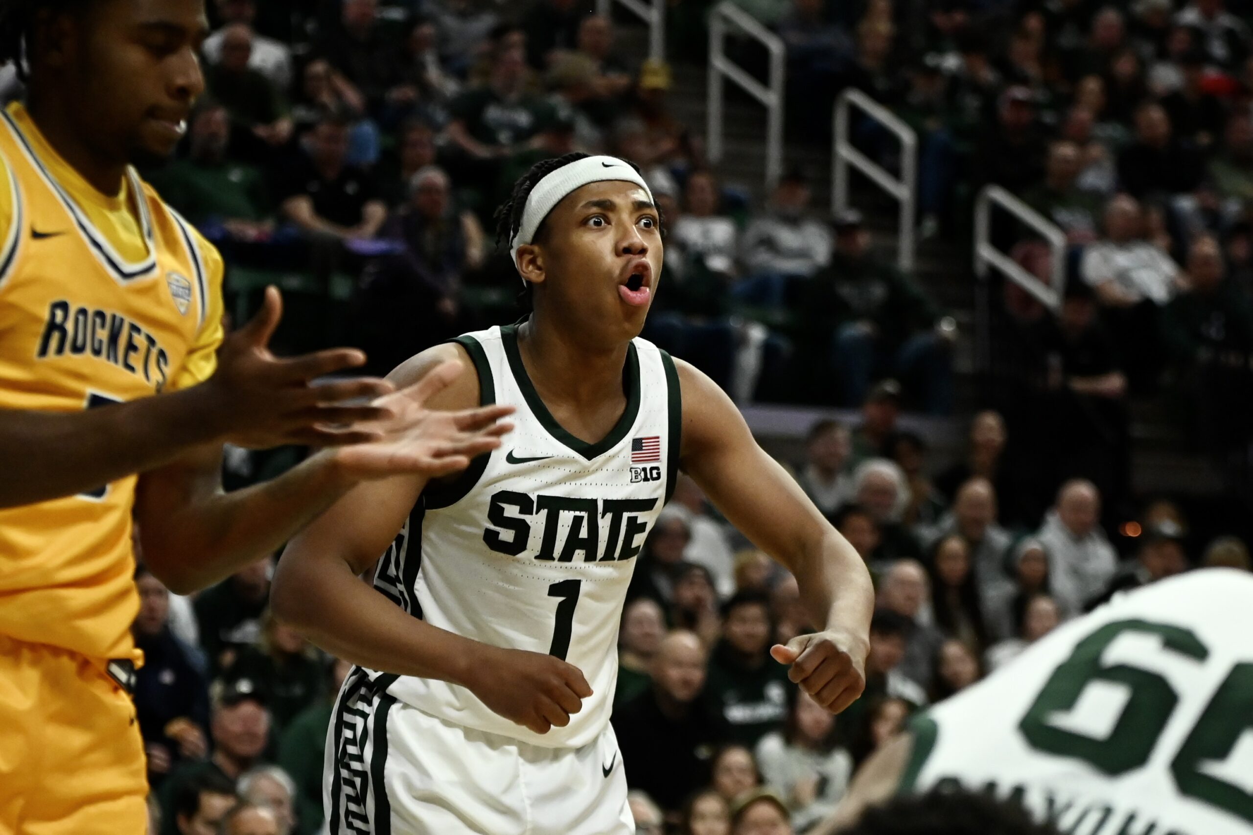 Jeremy Fears Jr. gestures following a Spartan basket in the first half against Toledo.