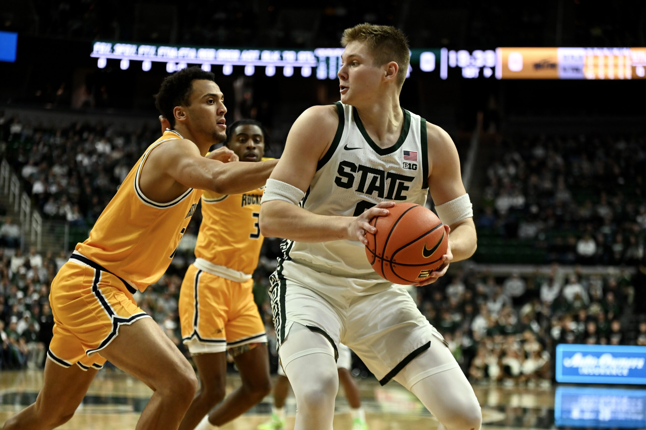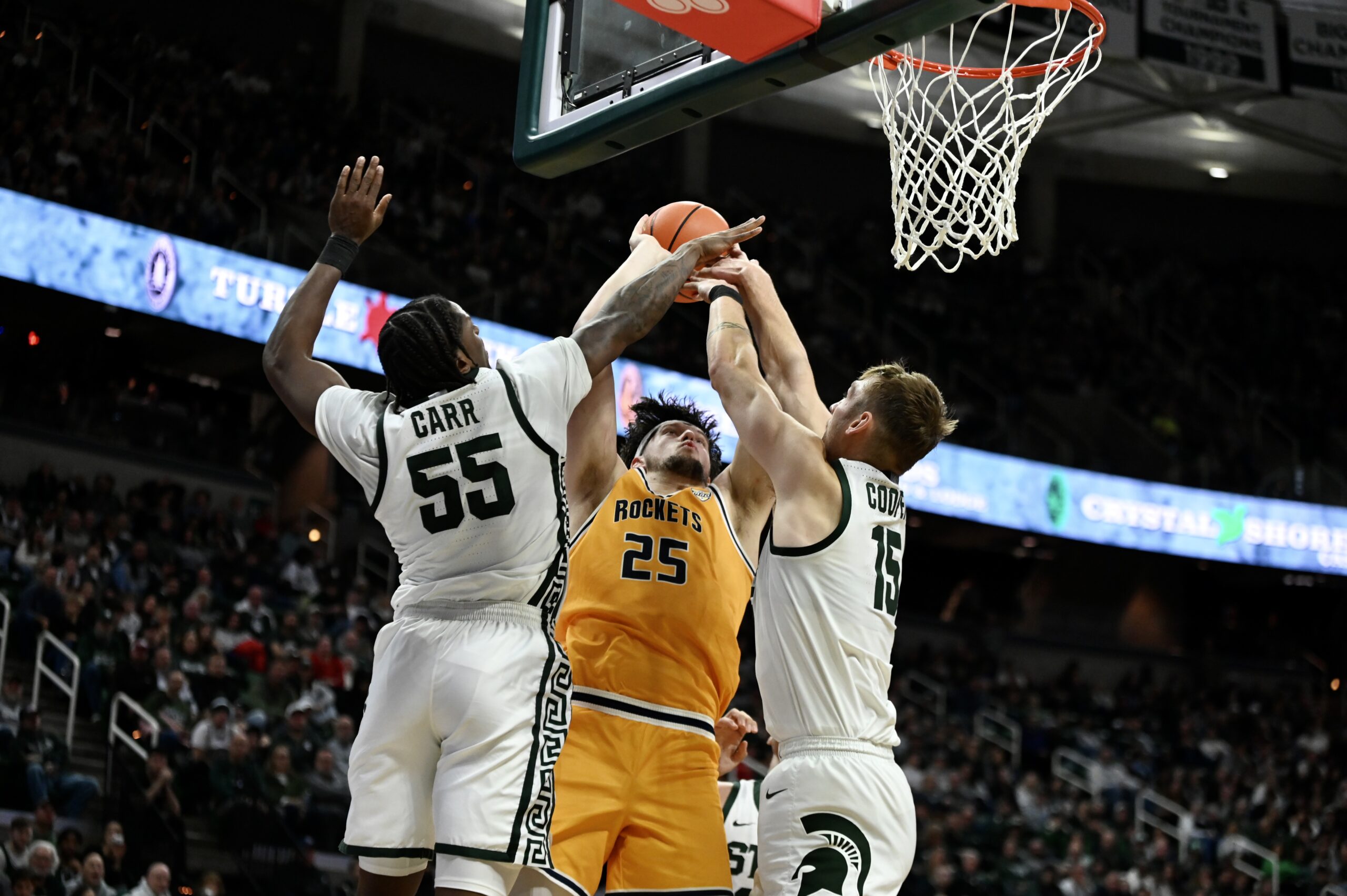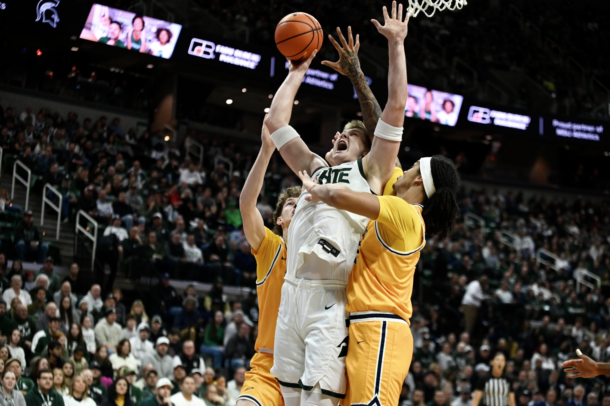 Jaxon Kohler grabs a rebound during Michigan State basketball’s win over Toledo.