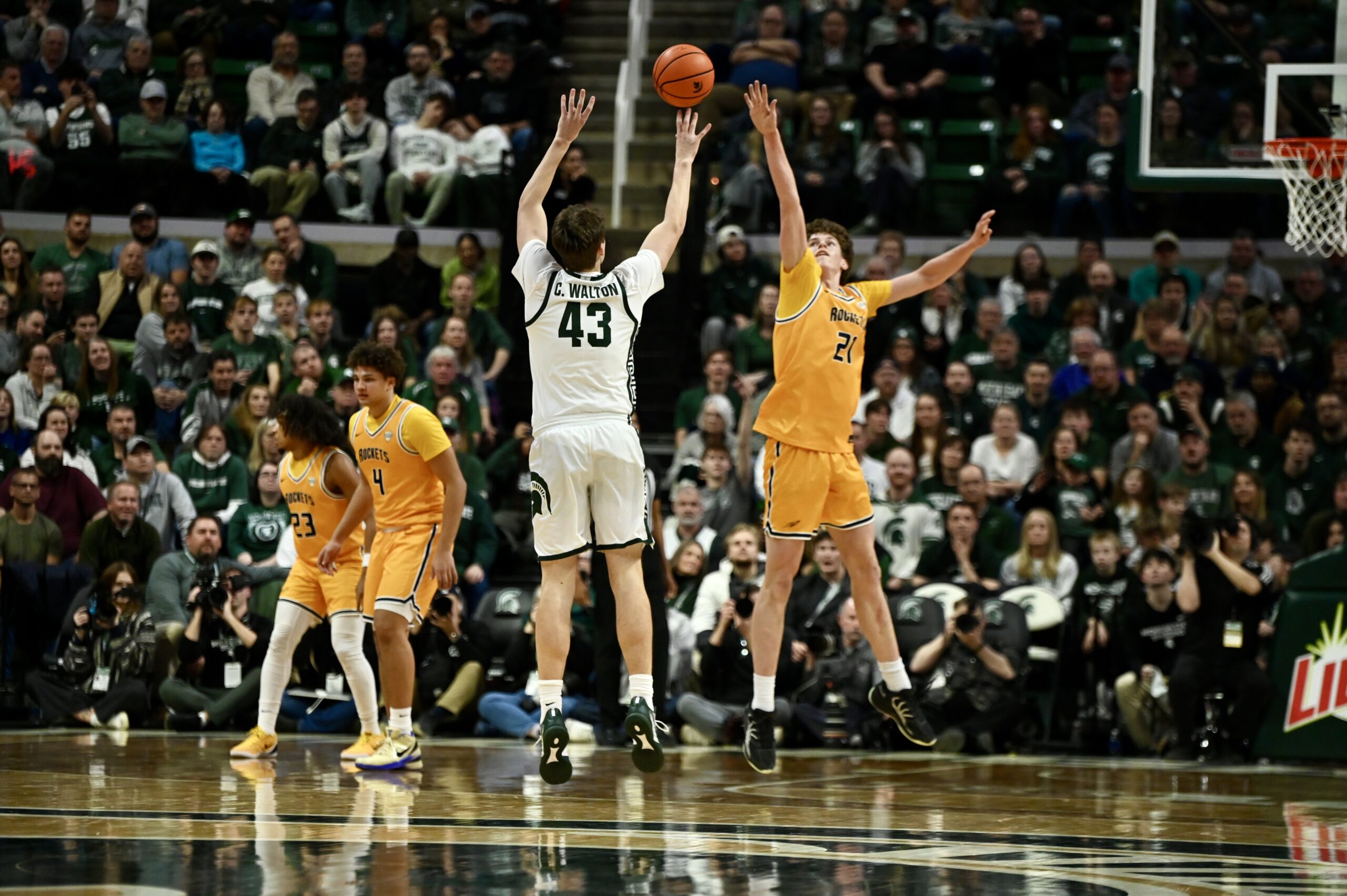 Colin Walton shoots his first career three-pointer against the Toledo Rockets.