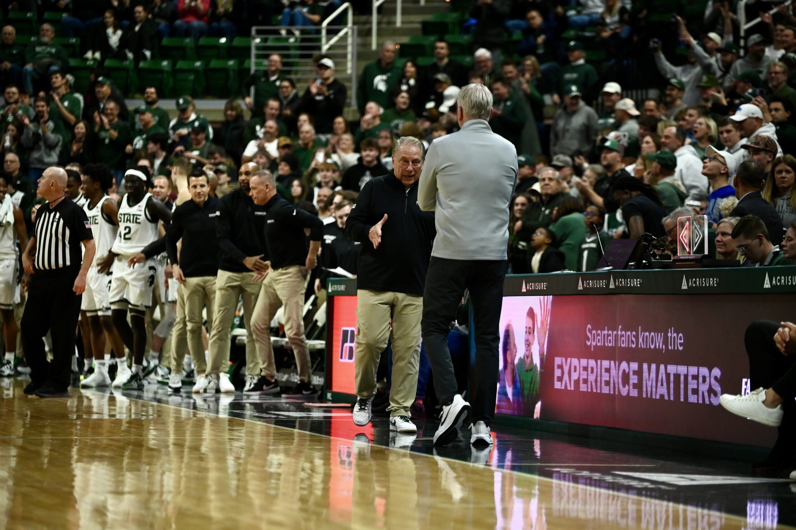 Tom Izzo shakes hands with Toledo head coach Tod Kowalczyk following the Spartans’ 92-69 win.