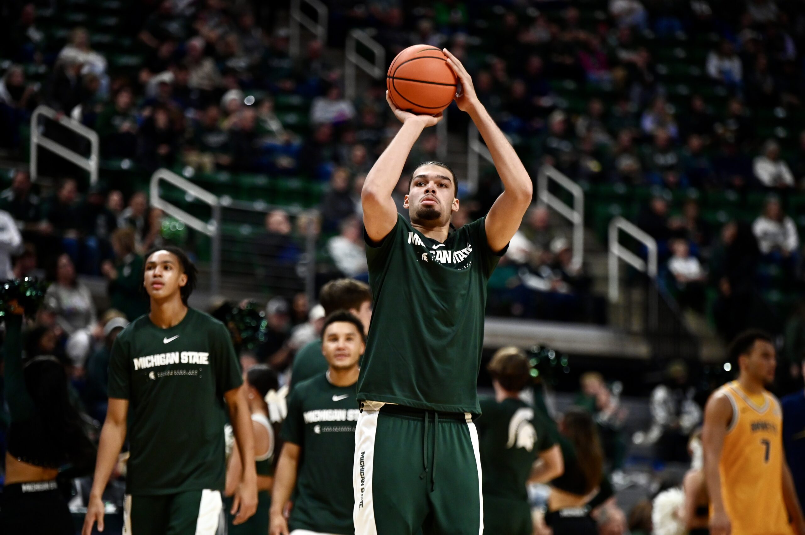 Jordan Scott prepares to shoot the ball in the first half of Michigan State basketball’s 92-69 win over Toledo.