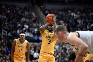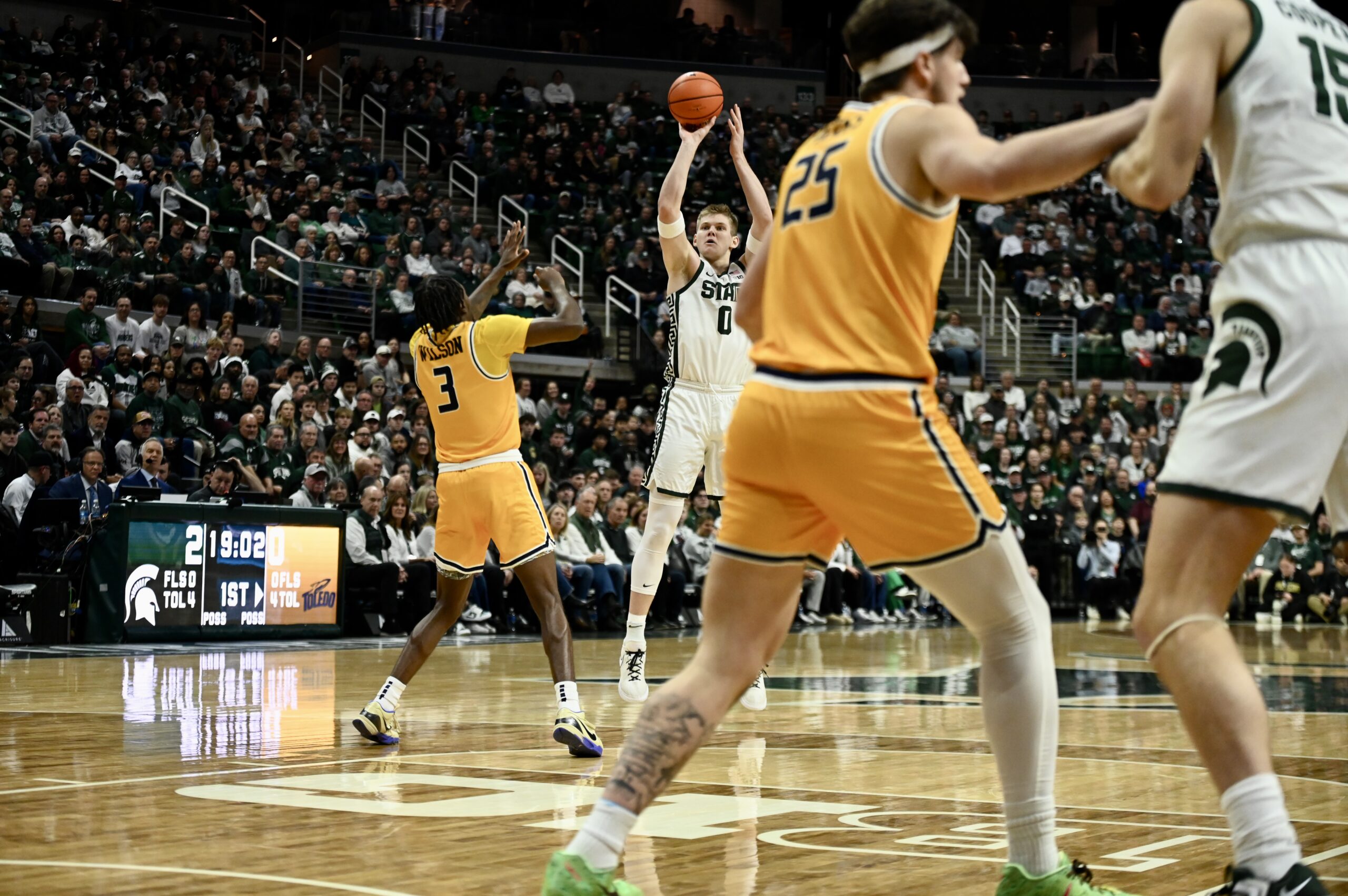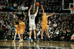 Jaxon Kohler shoots a three against Toledo during the Spartans’ 92-69 win.