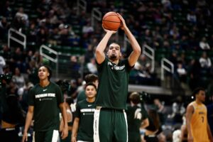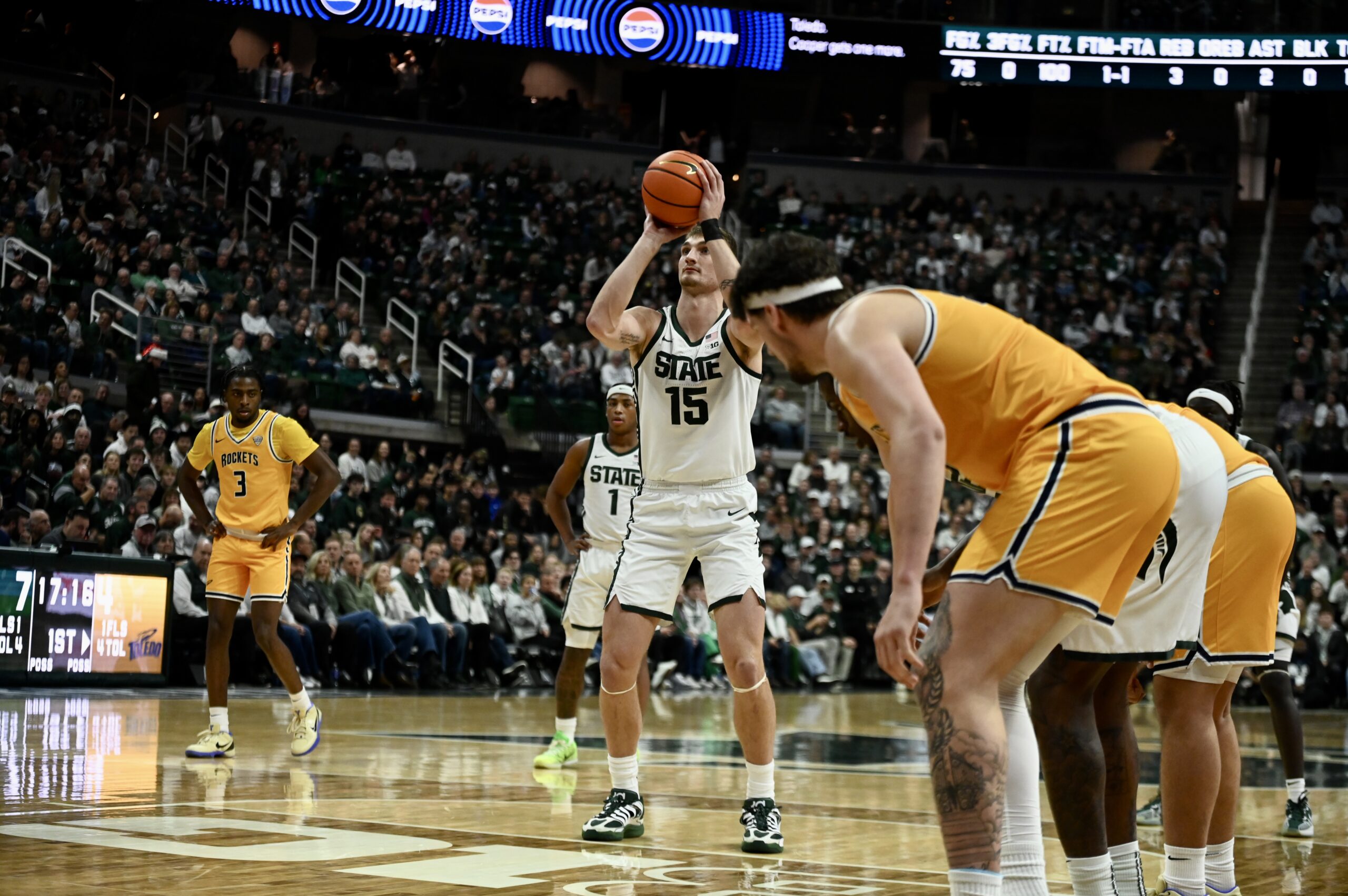 Carson Cooper shoots a free throw against Toledo amidst the Spartans’ 92-69 victory.