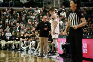 Jaxon Kohler gets coached up by Tom Izzo after subbing out of the game.