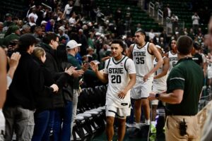 Carson Cooper claps for the military veteran honored prior to Michigan State basketball’s game against Toledo.