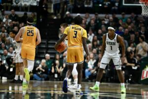 Carson Cooper (15), Coen Carr (55), and Jesse McCulloch (35) walk up court during Michigan State basketball’s 92-69 win over Toledo.