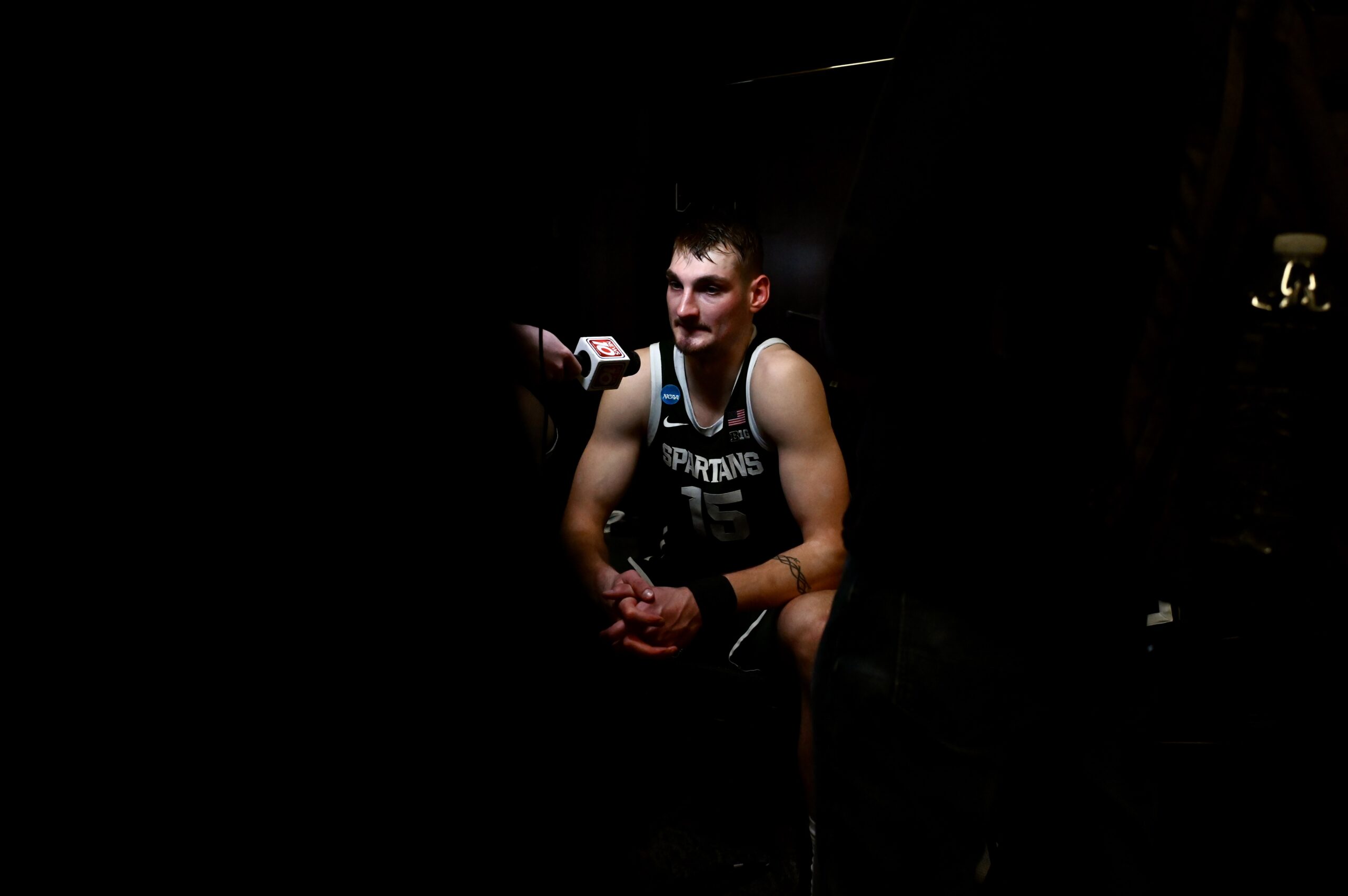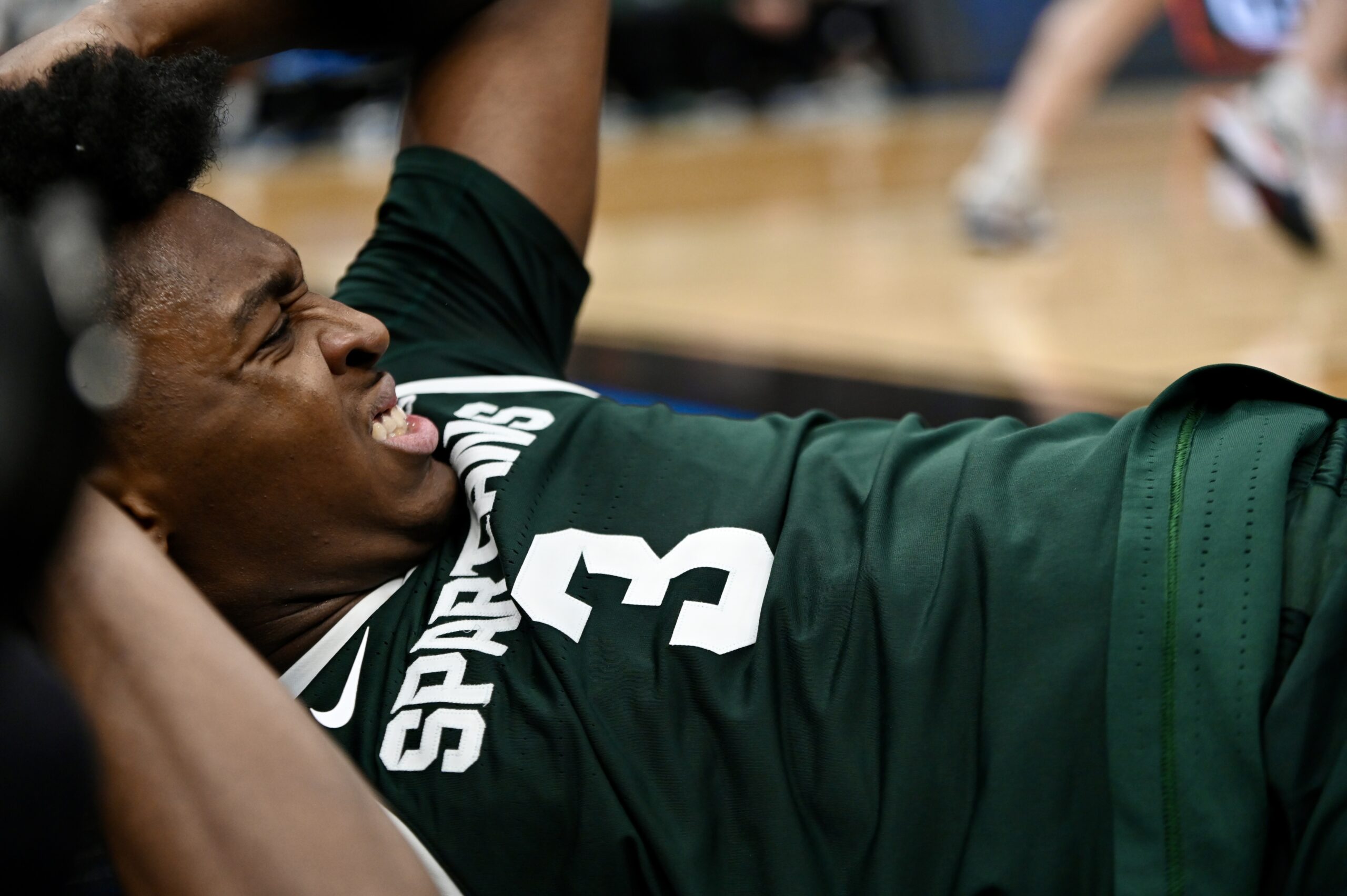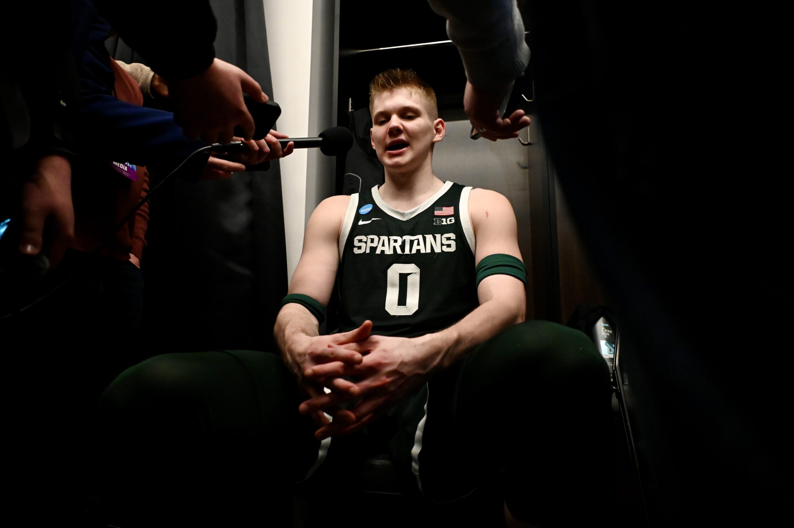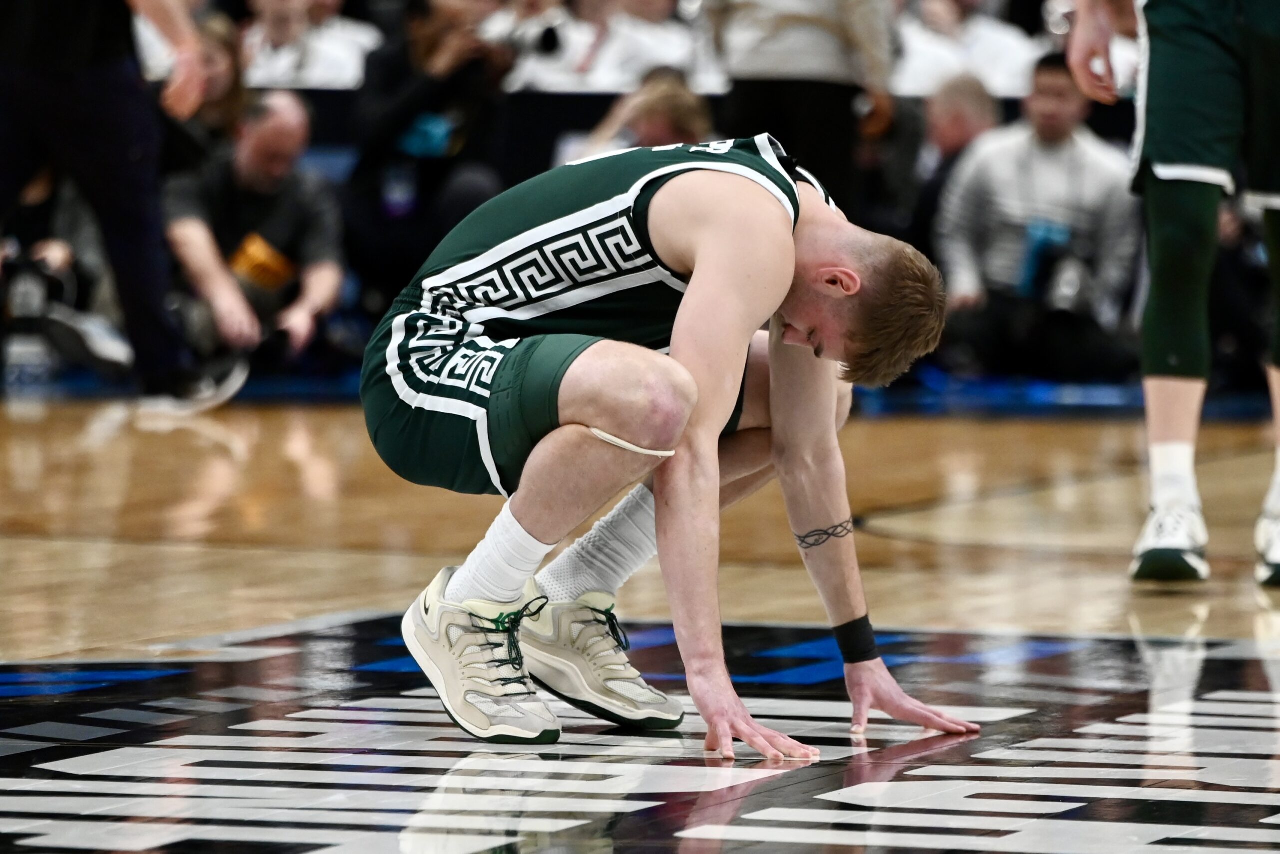 Carson Cooper crouches after Michigan State basketball’s season comes to an end at the hands of UConn.