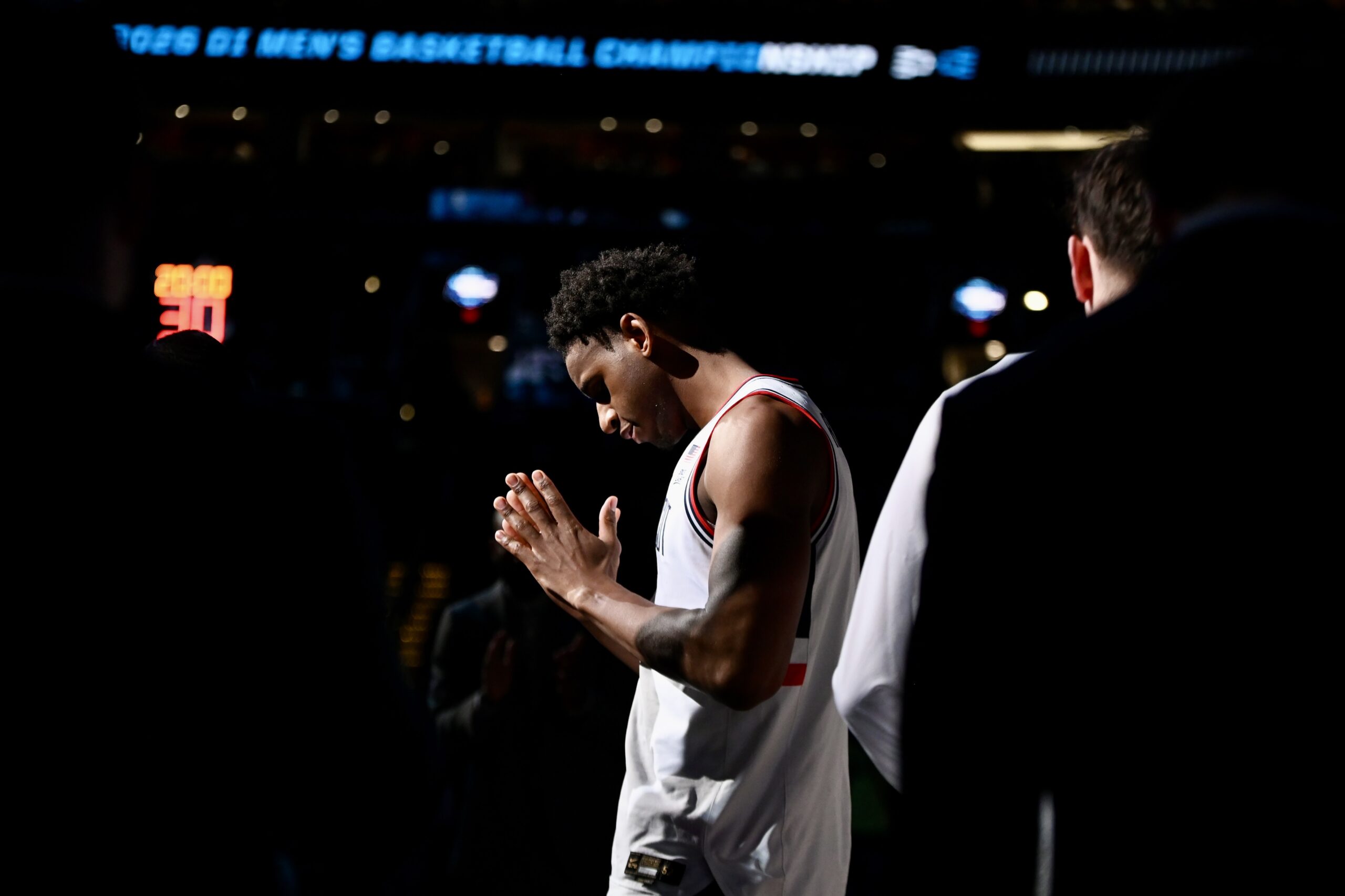 Tarris Reed Jr. prays before his matchup with Michigan State basketball.