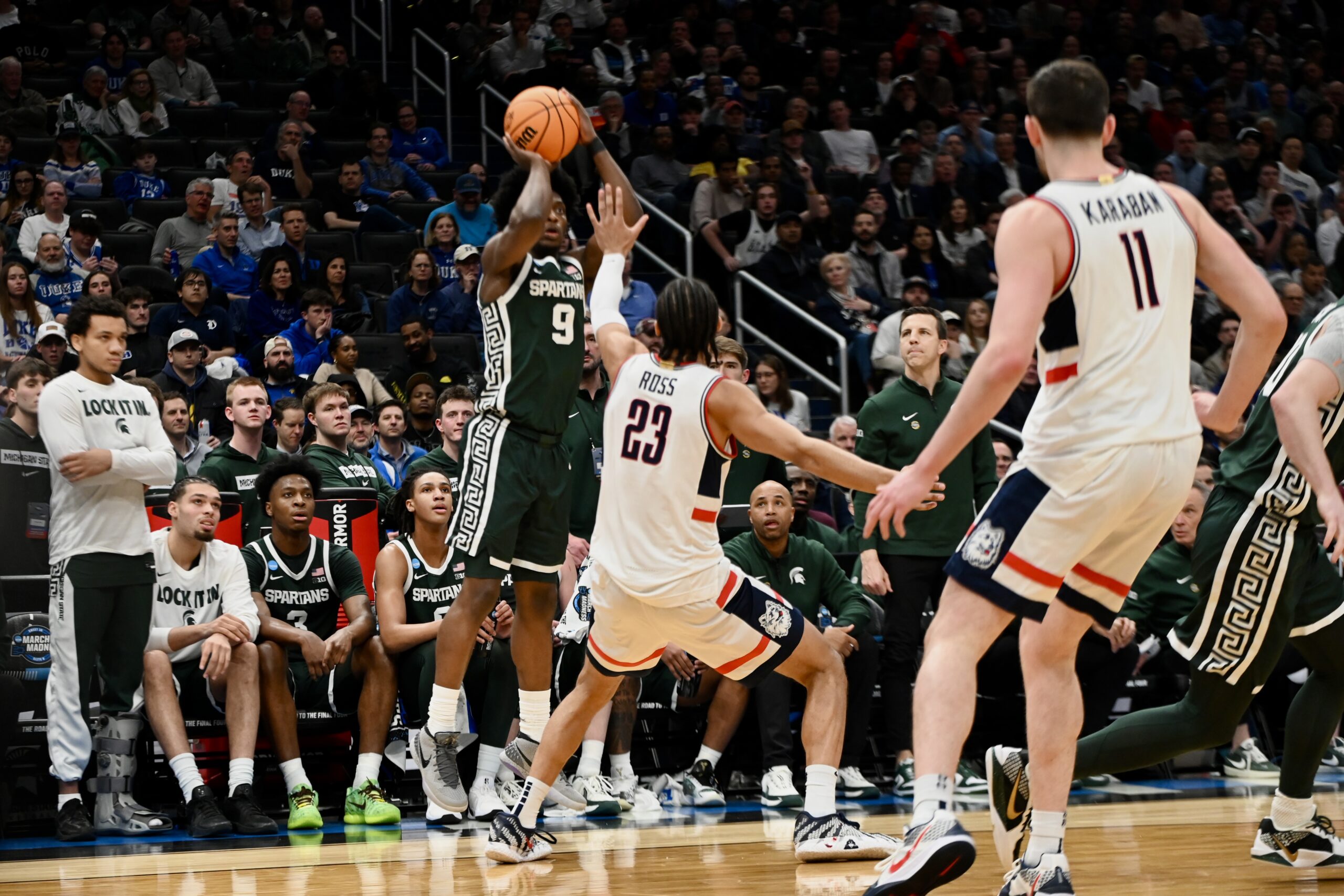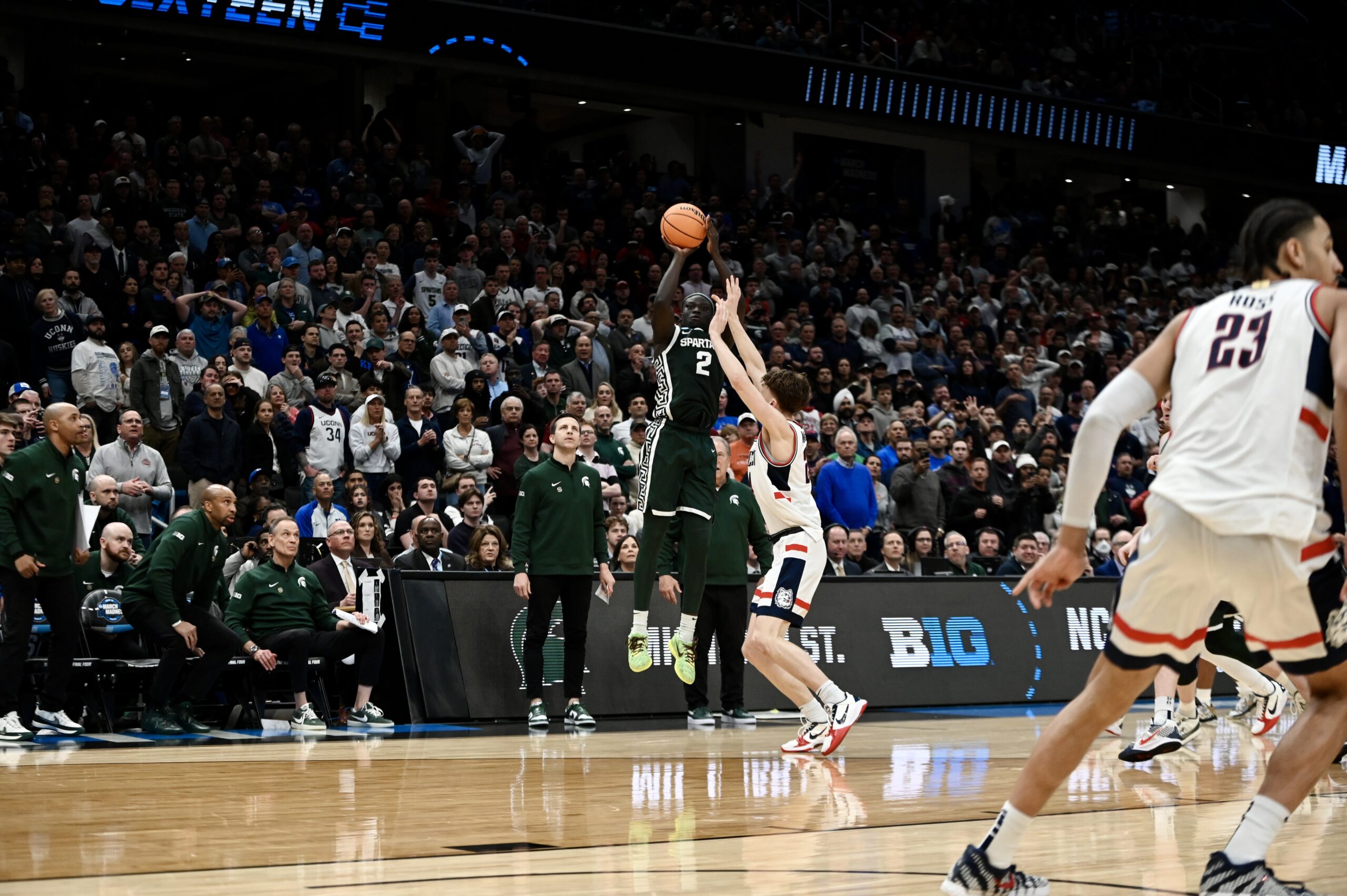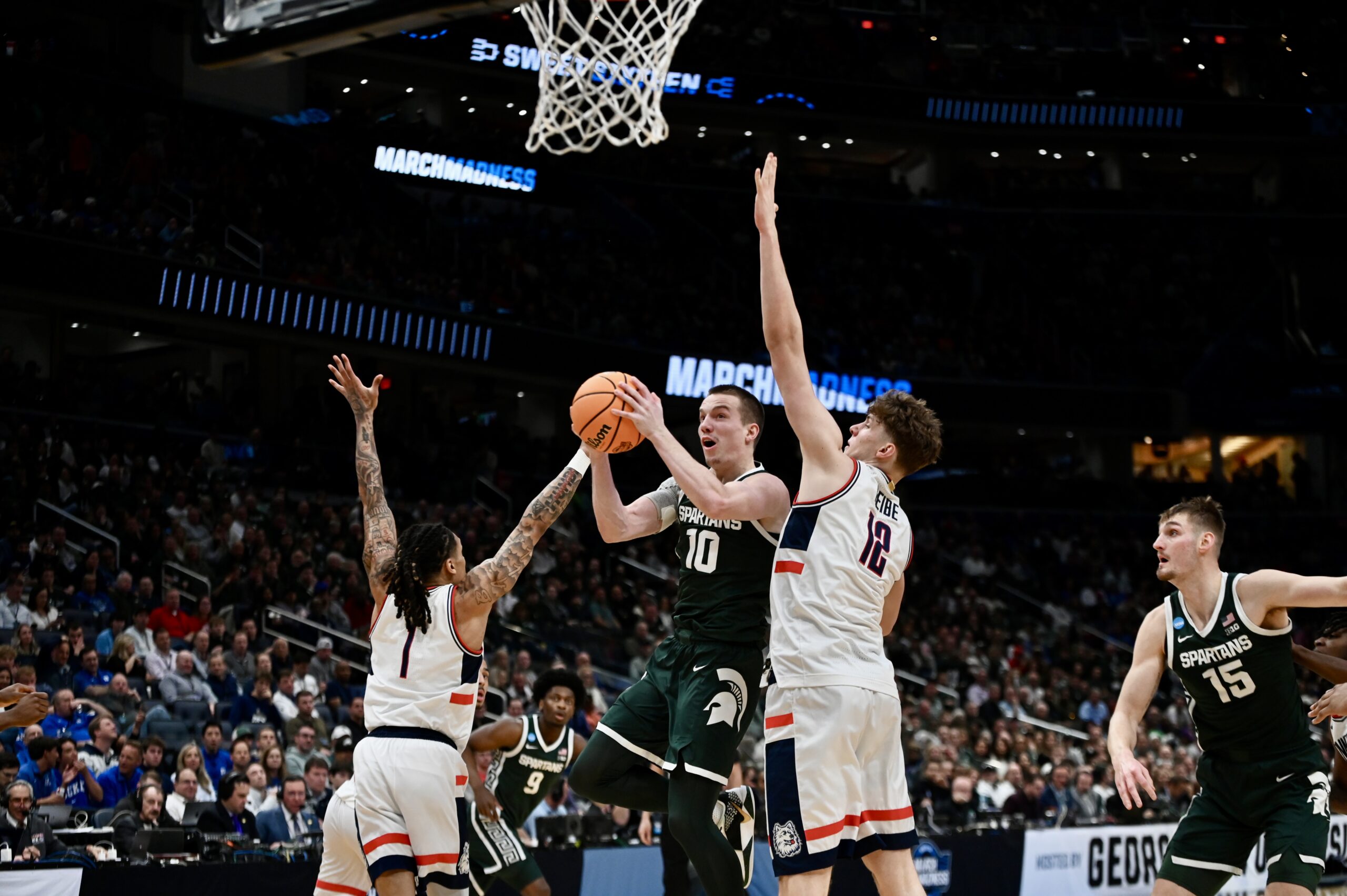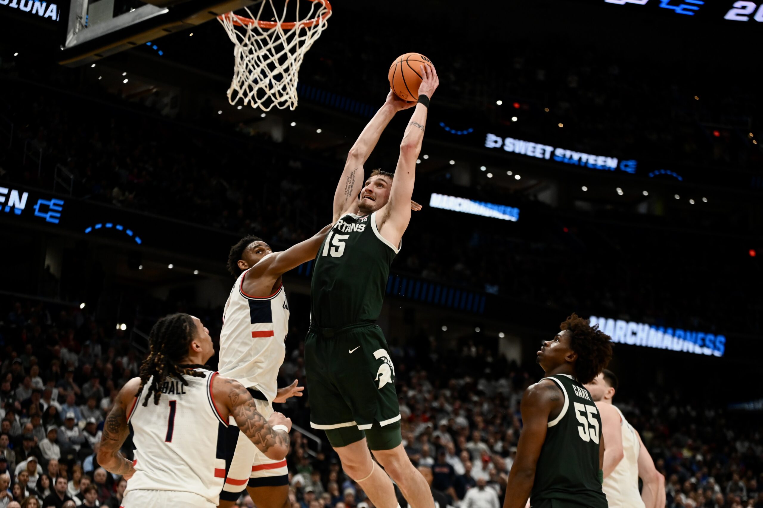 On Friday, Michigan State basketball fell to UConn in the Sweet 16. The Spartans rallied from down 19 points to lead in the second half, but ran out of gas in the end. The trip to Washington D.C. was the end of the road for the Spartans, with a long offseason beginning. This game also marked the end of the collegiate careers for Carson Cooper, Jaxon Kohler, Trey Fort III, Denham Wojcik, and Nick Sanders.