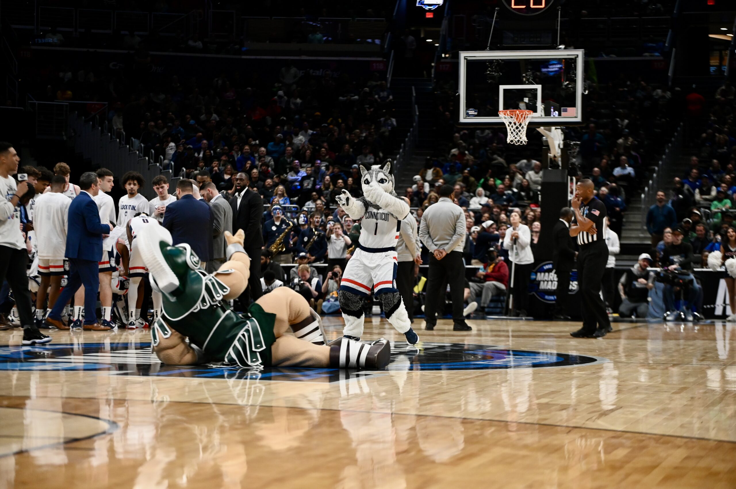 Sparty sits by as UConn’s mascot dances in the mid-game dance off.
