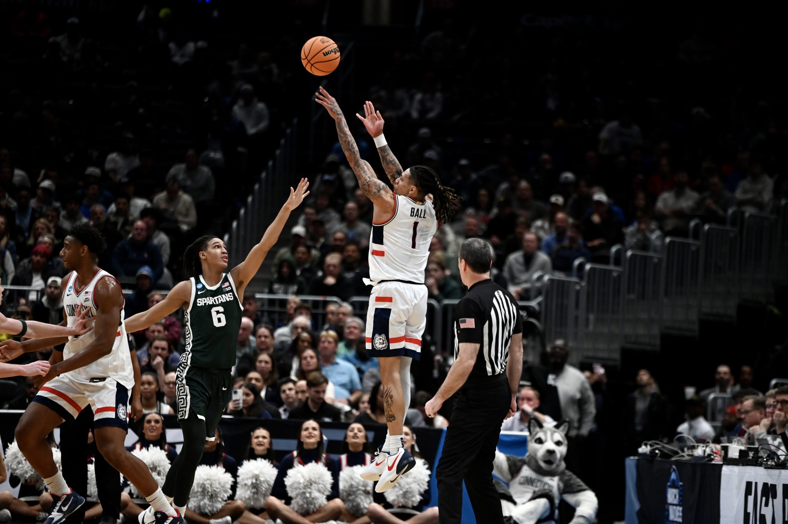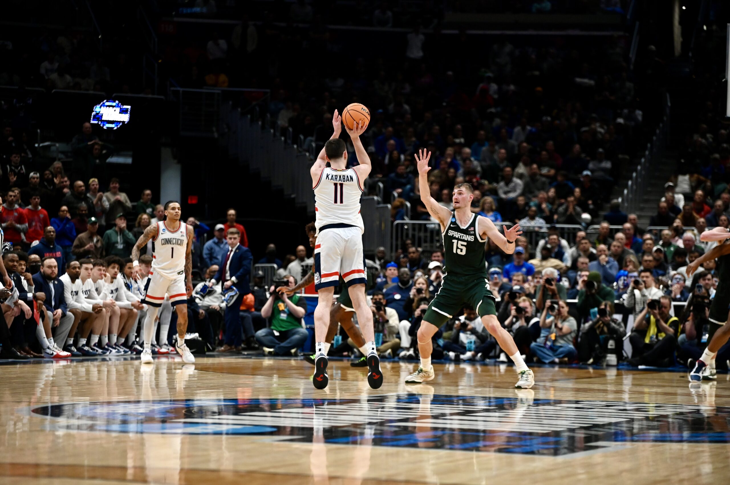 Alex Karaban shoots a three from the logo that falls.