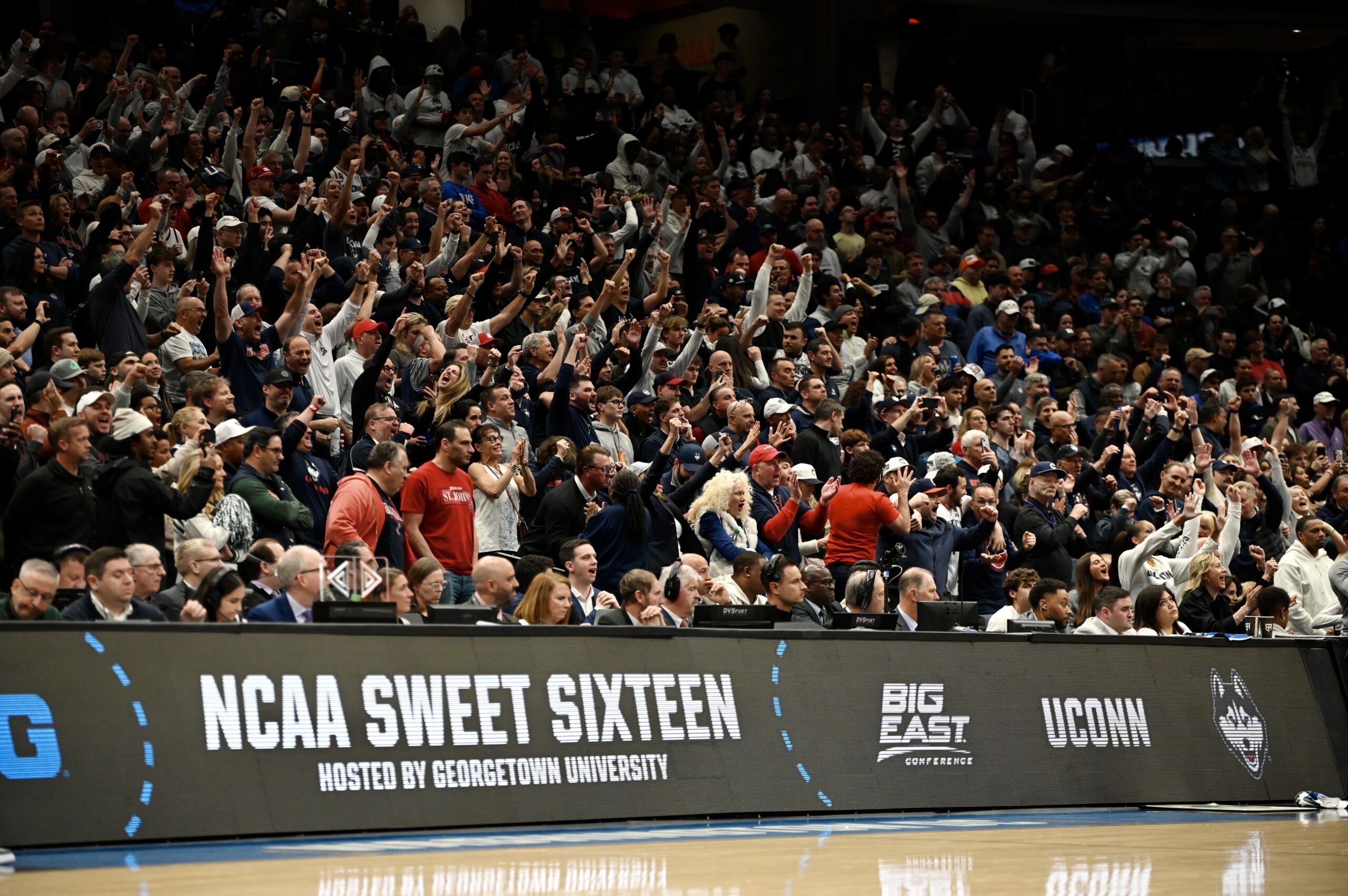 The UConn fans rejoice as free throws fall through to give the Huskies a four-point lead.
