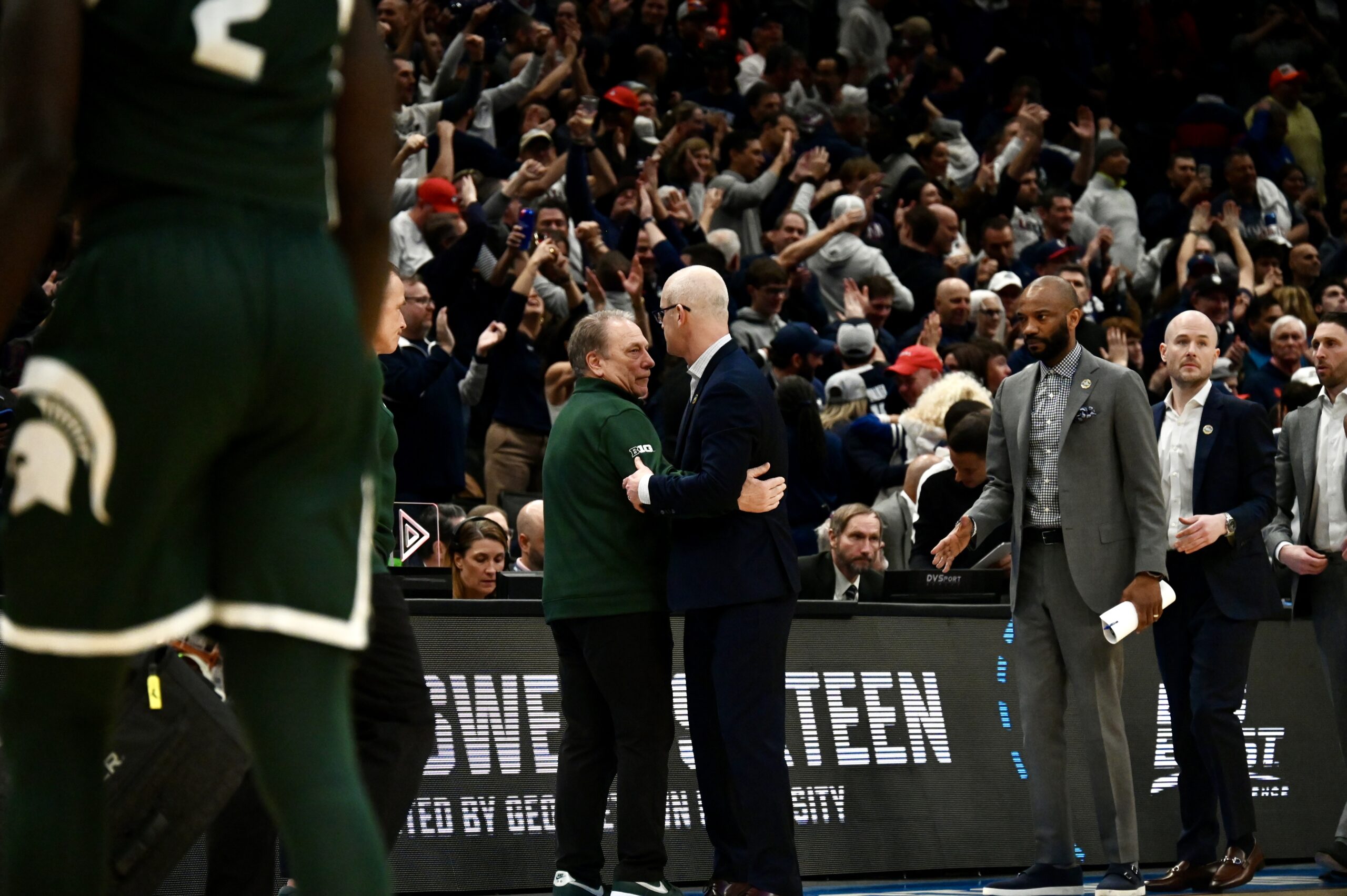 Tom Izzo and Dan Hurley embrace after Michigan State falls to UConn in the Sweet 16.