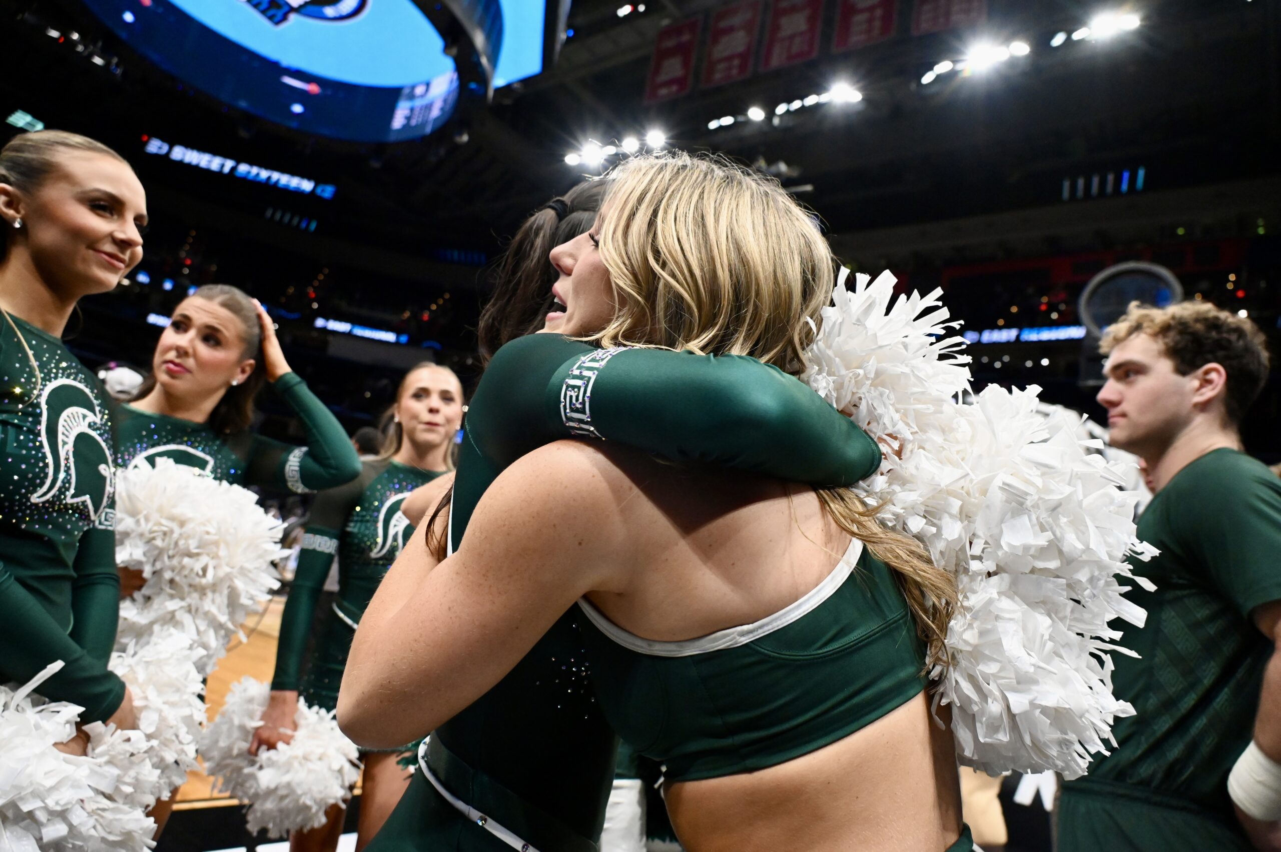 The Spartan cheerleaders embrace as their season comes to a close.