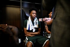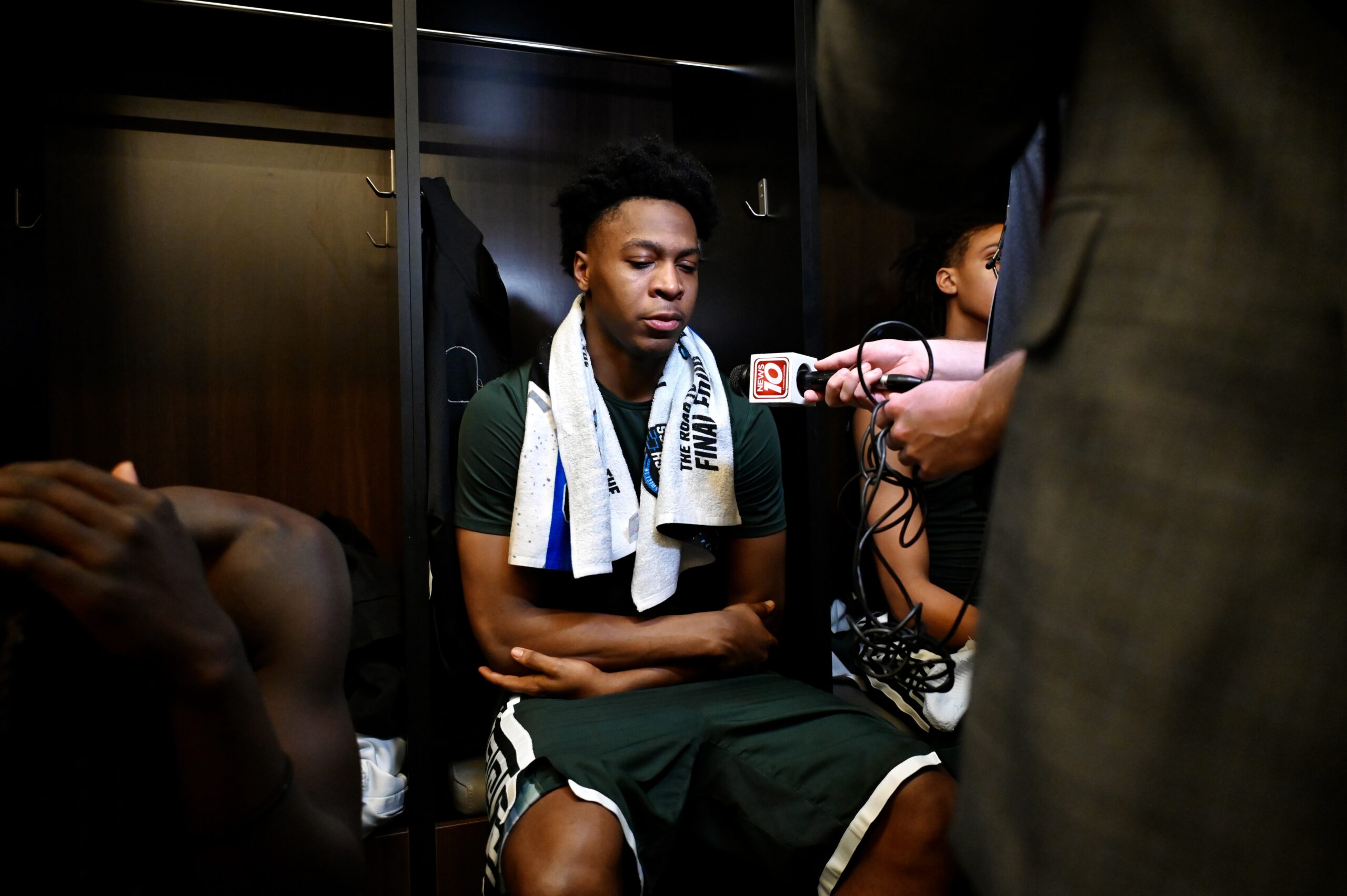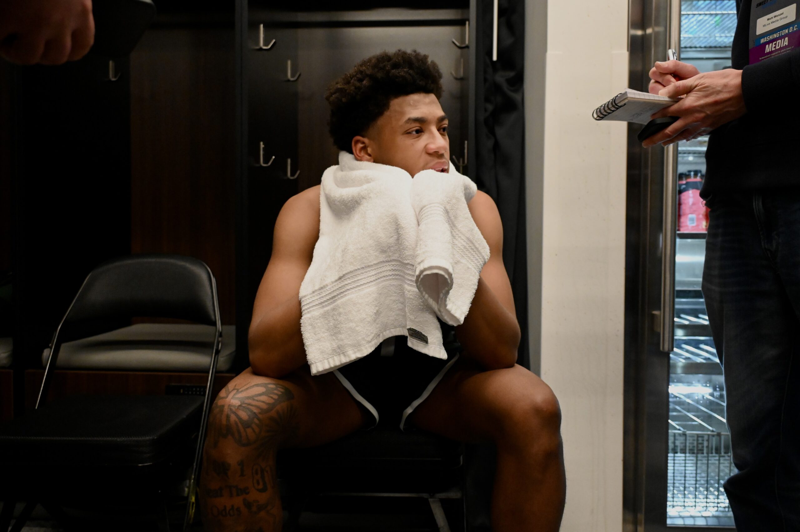 Jeremy Fears Jr. sits at his locker after a loss to UConn.