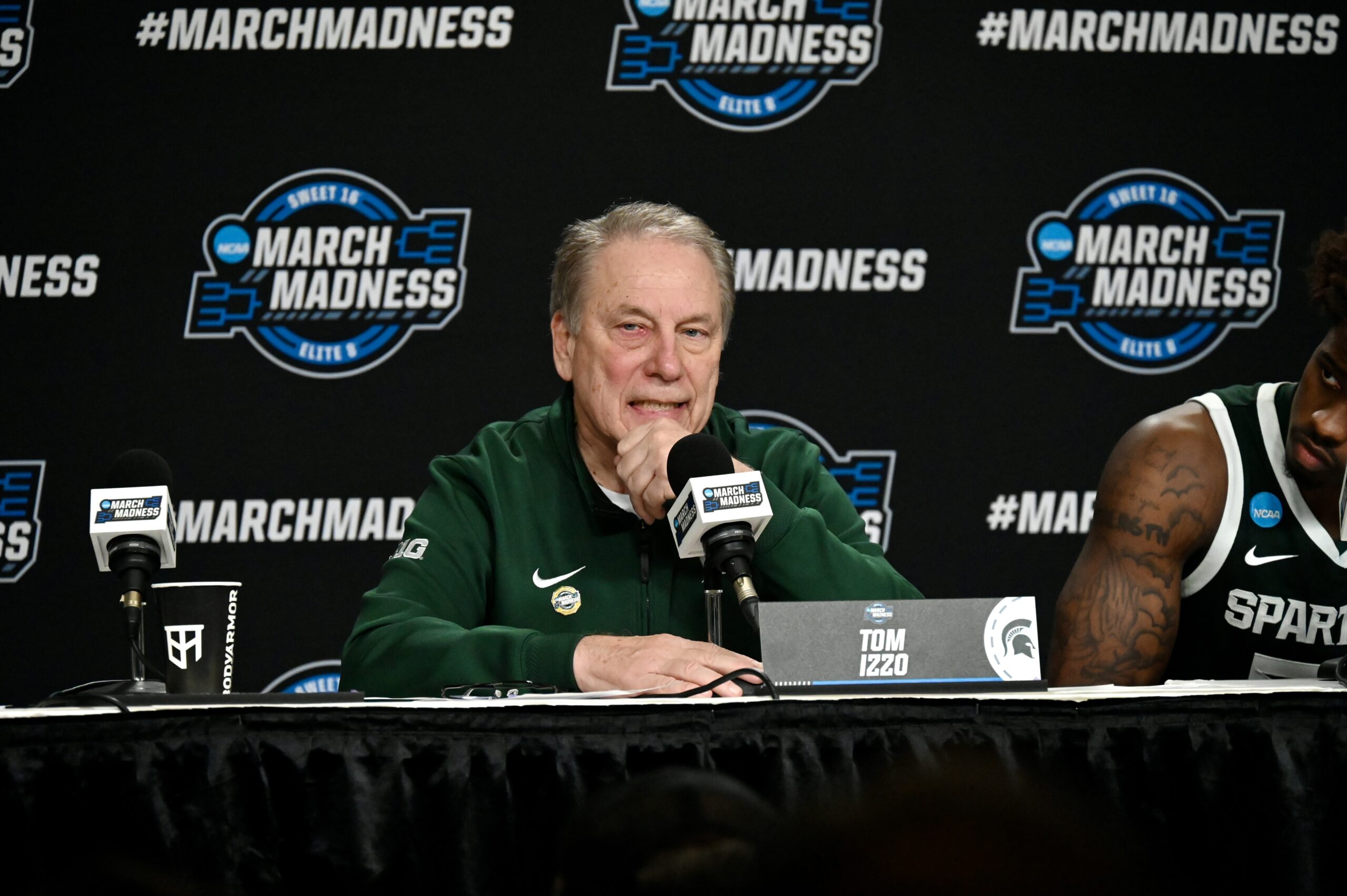 Tom Izzo talks to the media.