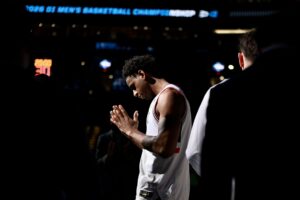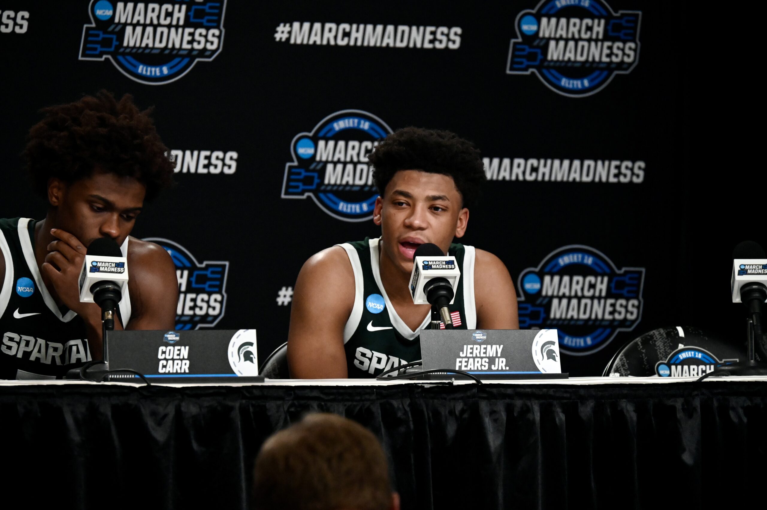Coen Carr answers questions after the loss to UConn in the Sweet 16.