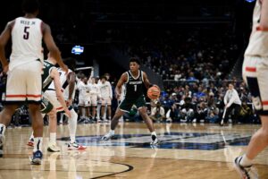 Jeremy Fears Jr. dribbles up the the court against UConn.