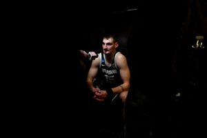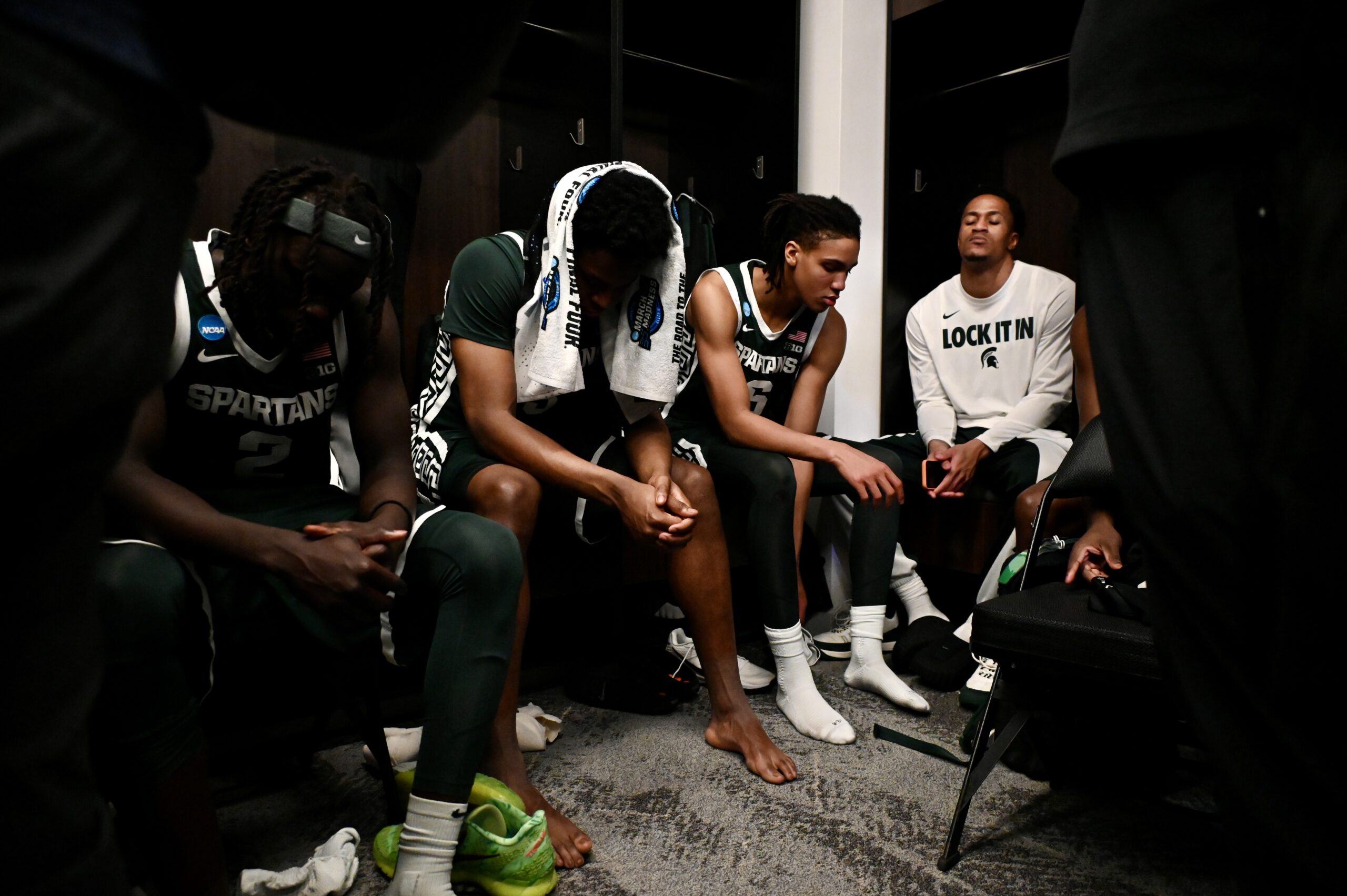 Kur Teng, Cam Ward, Jordan Scott, and Kaleb Glenn all sit at their lockers after the loss to UConn.