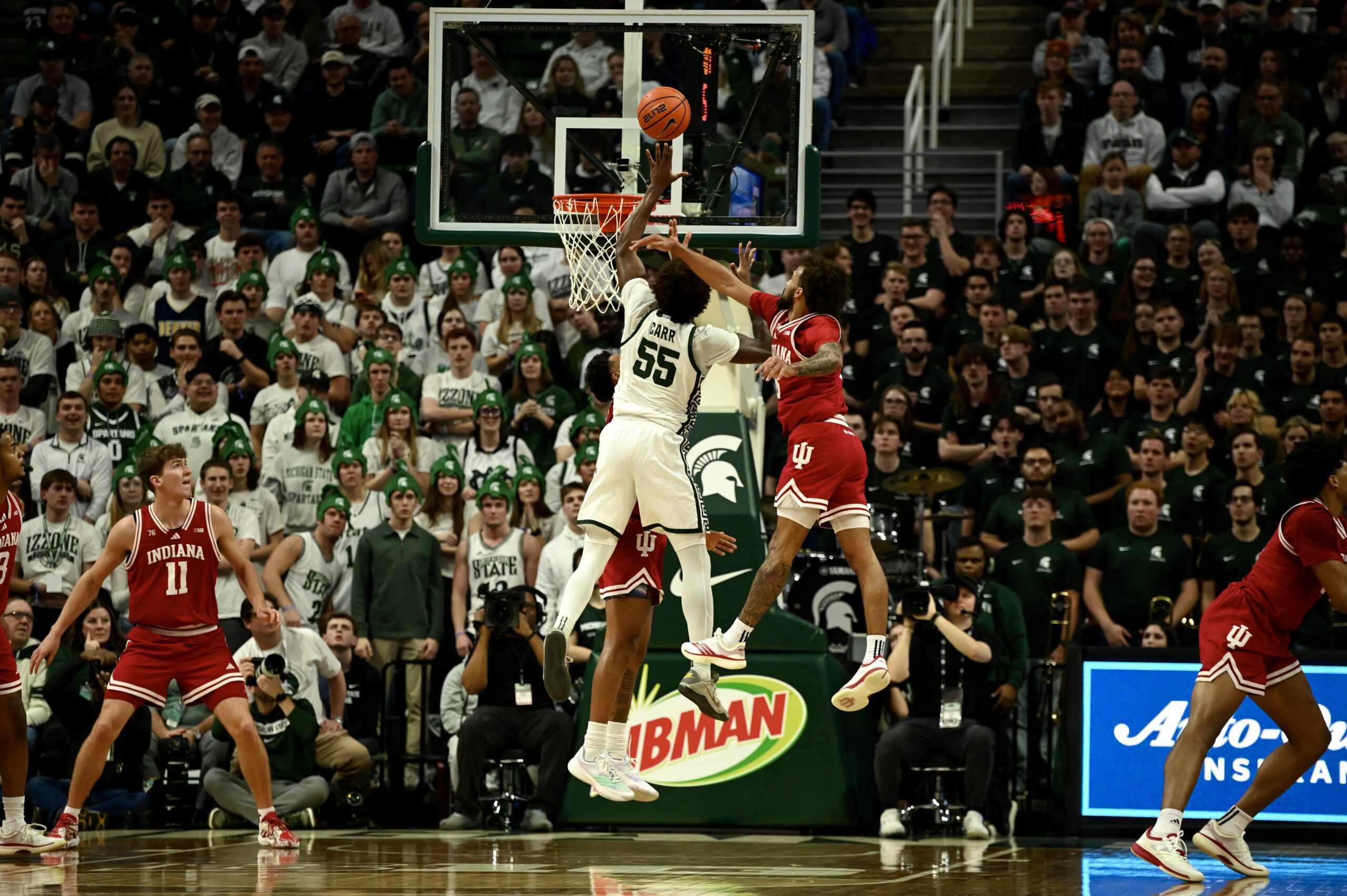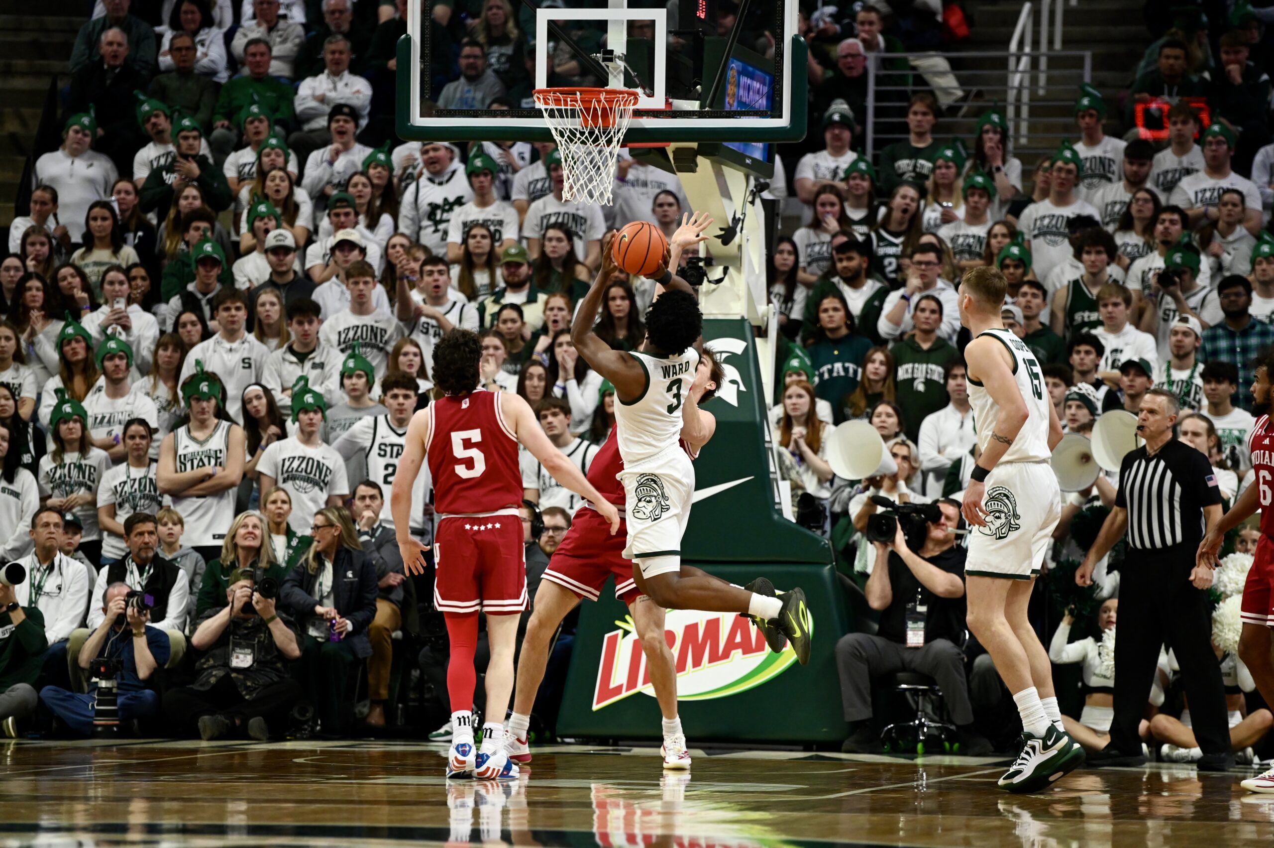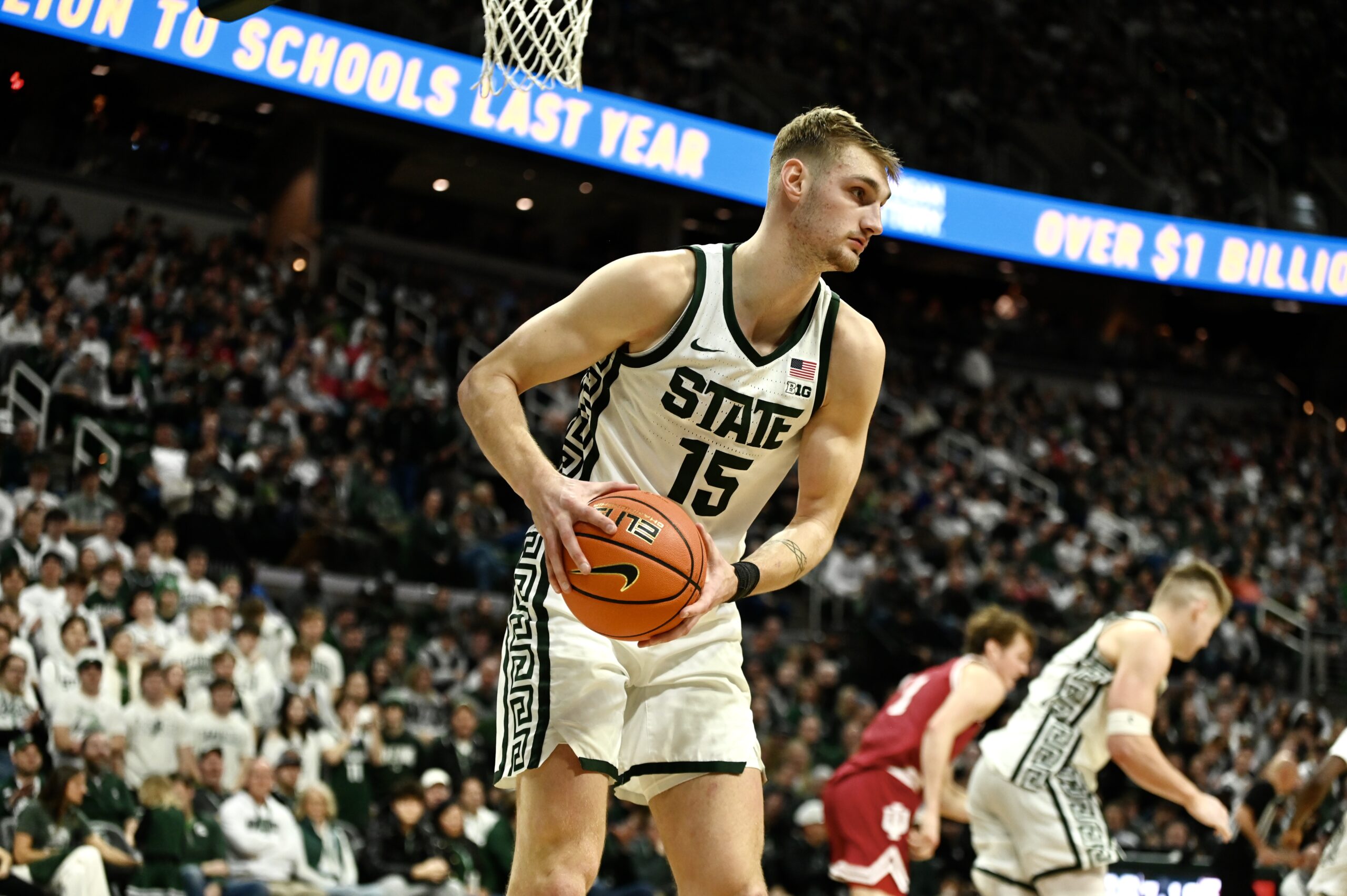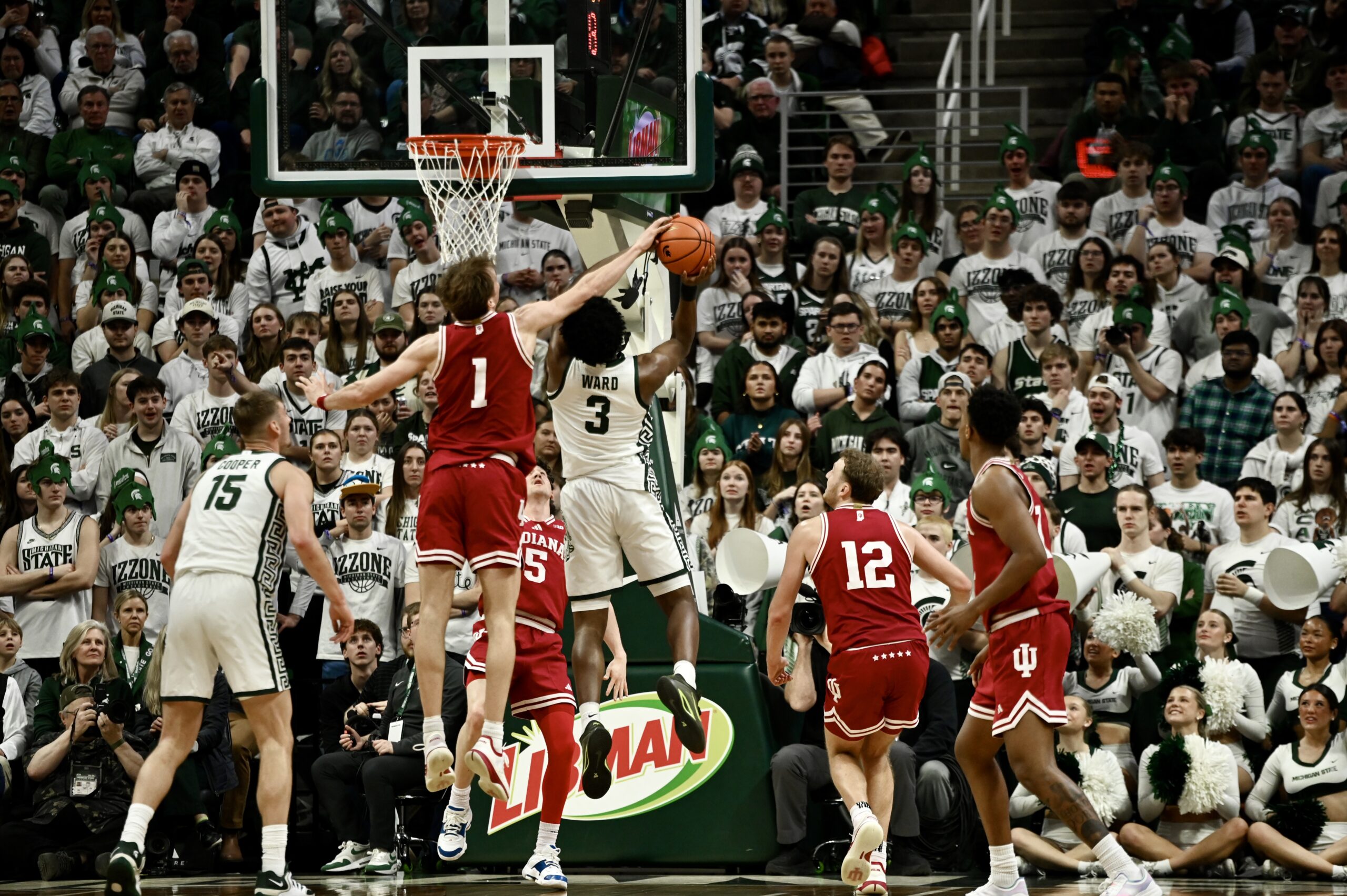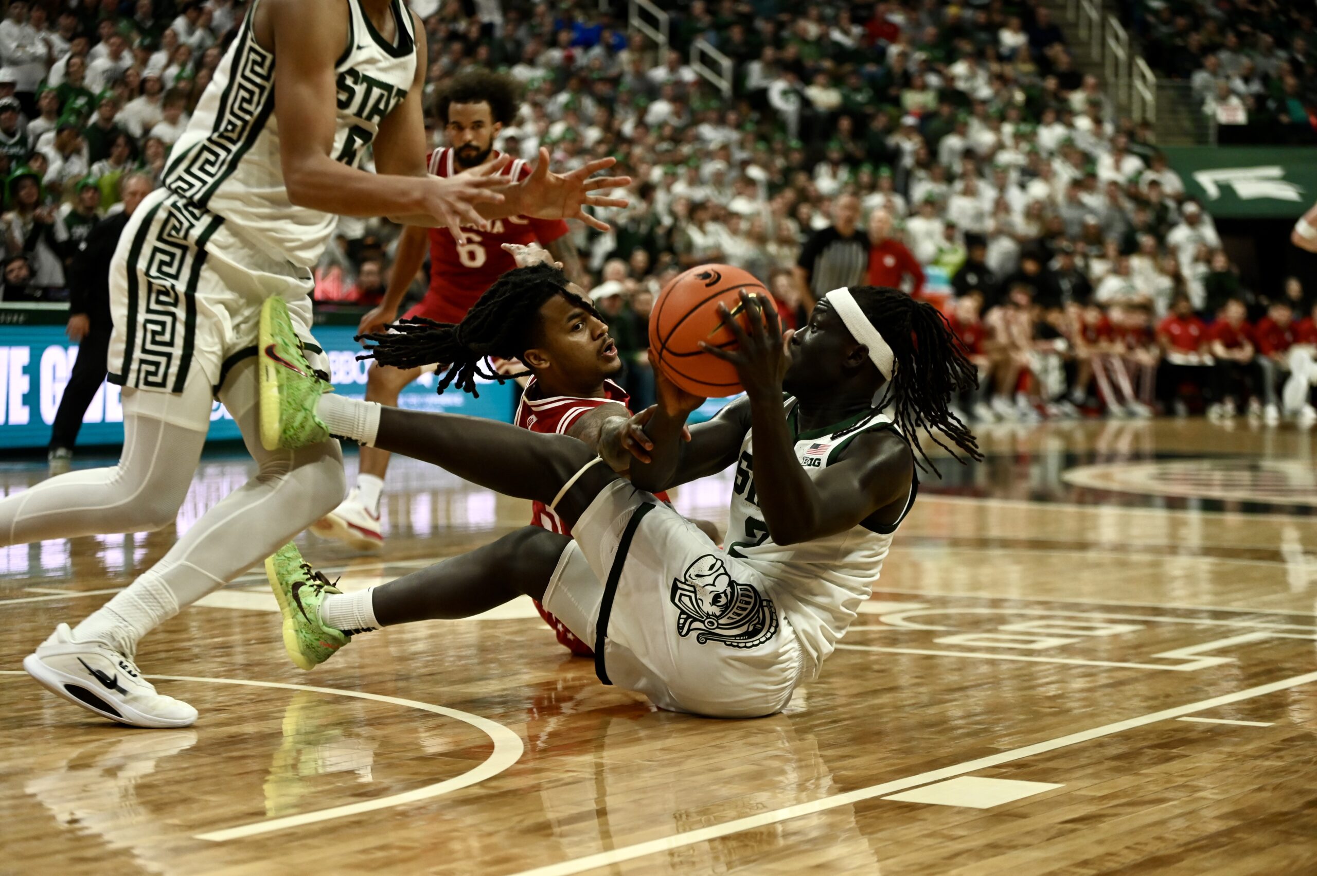 Jaxon Kohler also added his own double-double, and freshman Jordan Scott had his first game with double digit points, scoring 11. The crucial stretch for MSU came when the game was tied 53-53, as the Spartans kept Indiana off the boards for 10 minutes of game time and went on a 19-0 run, powered by Ward and Scott scoring 8 of the first 10 points in the run.