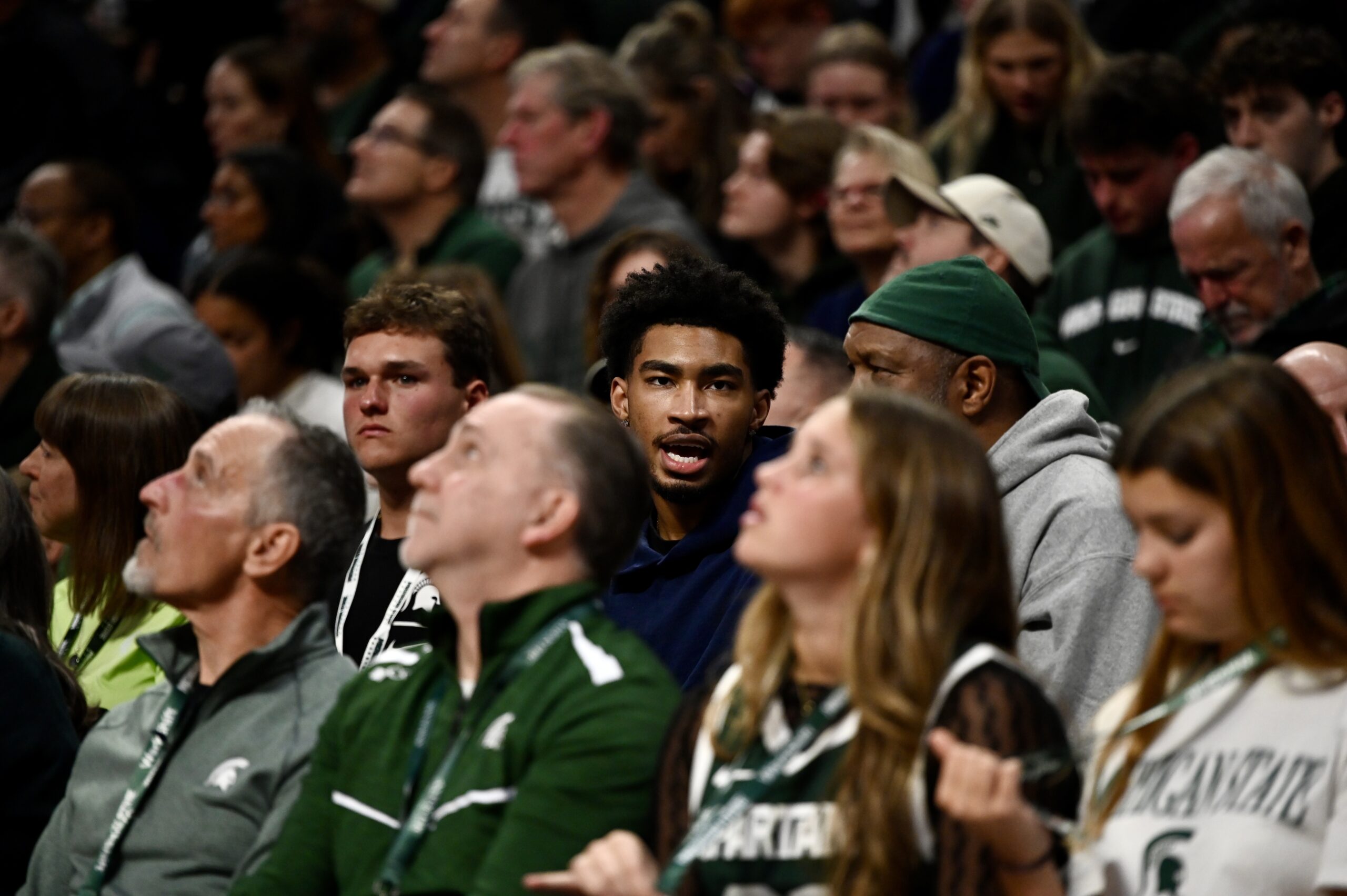 Jaden Akins (middle, in blue) was back in attendance for Michigan State basketball’s game against Indiana.