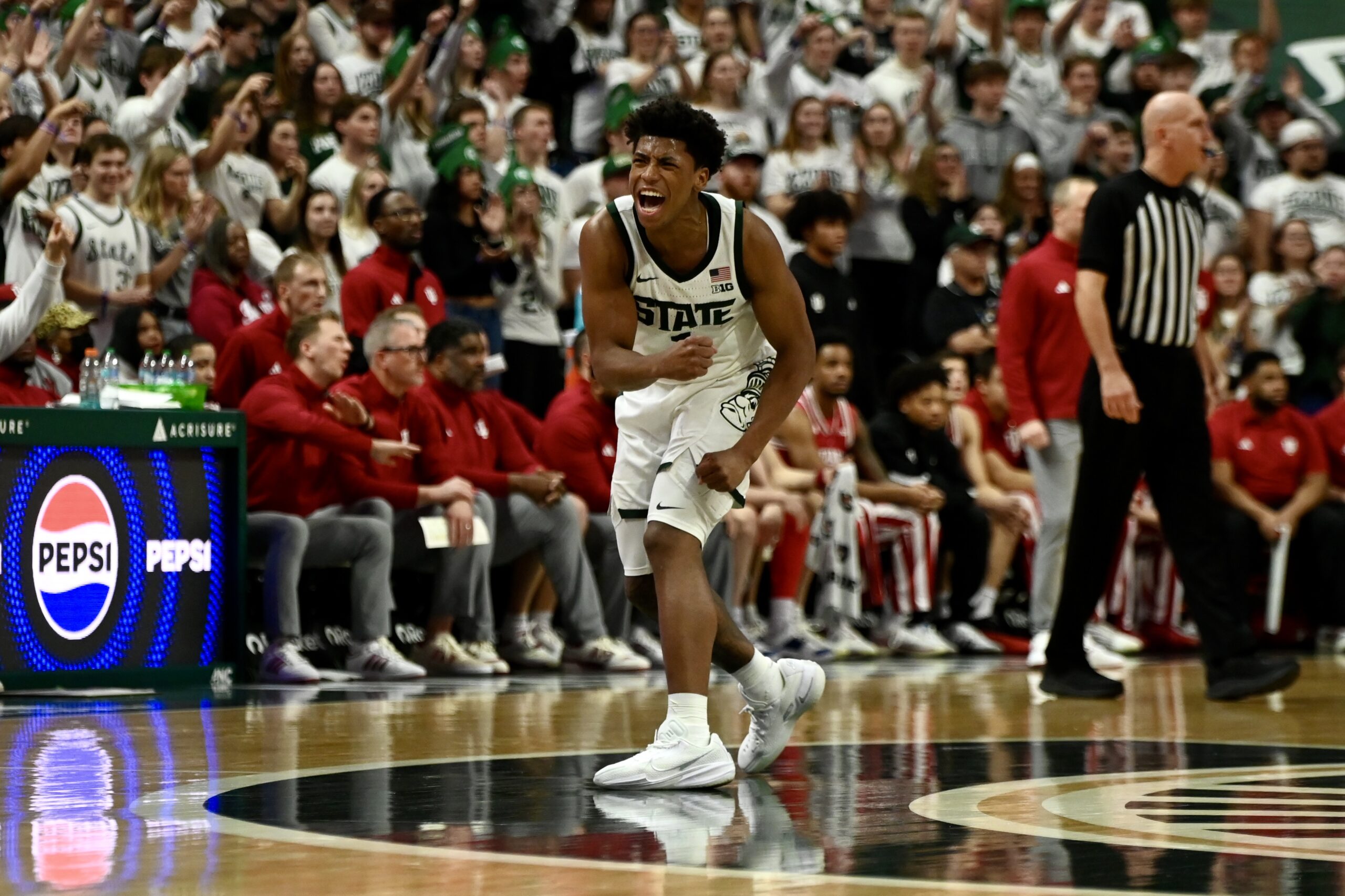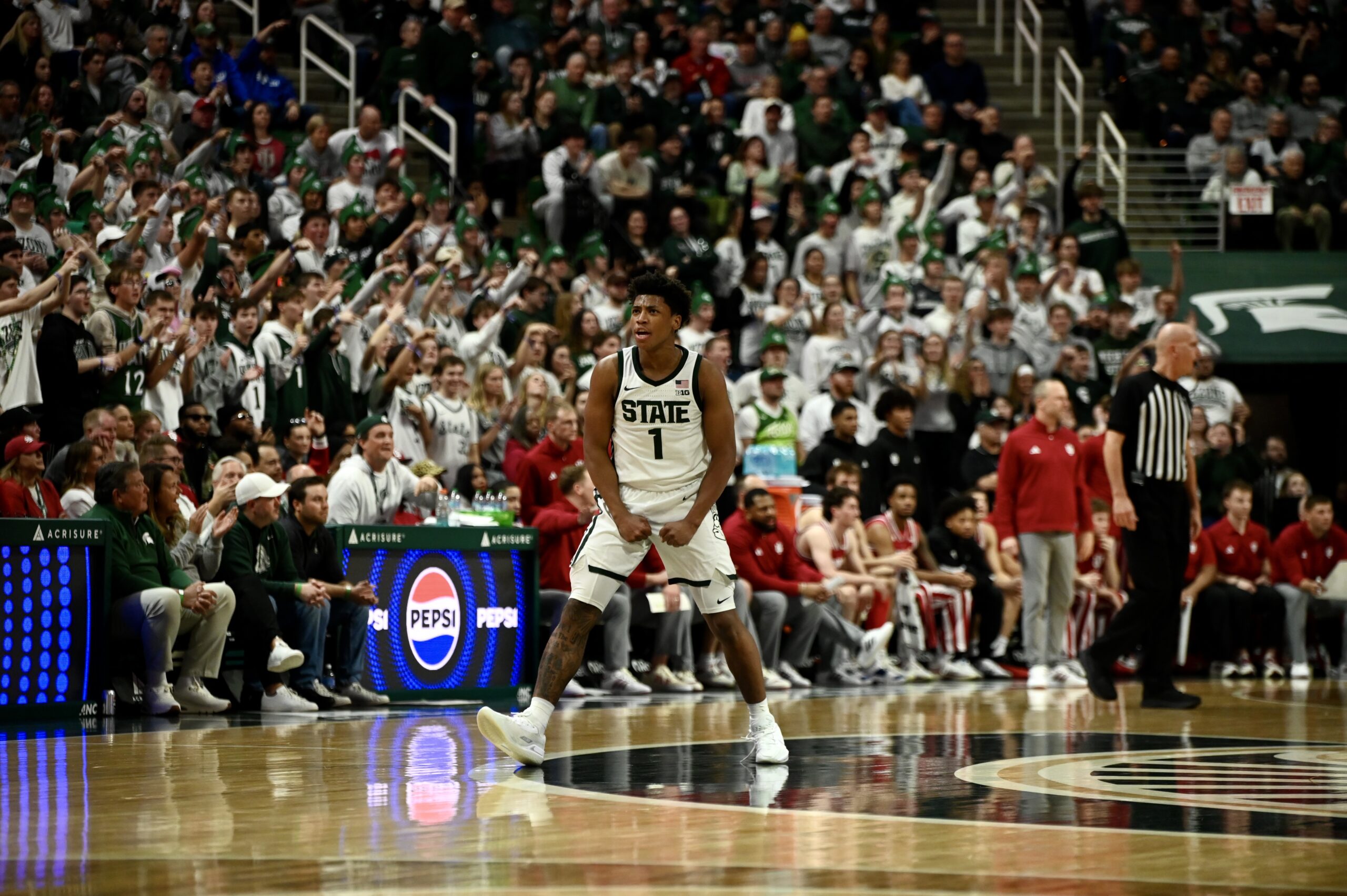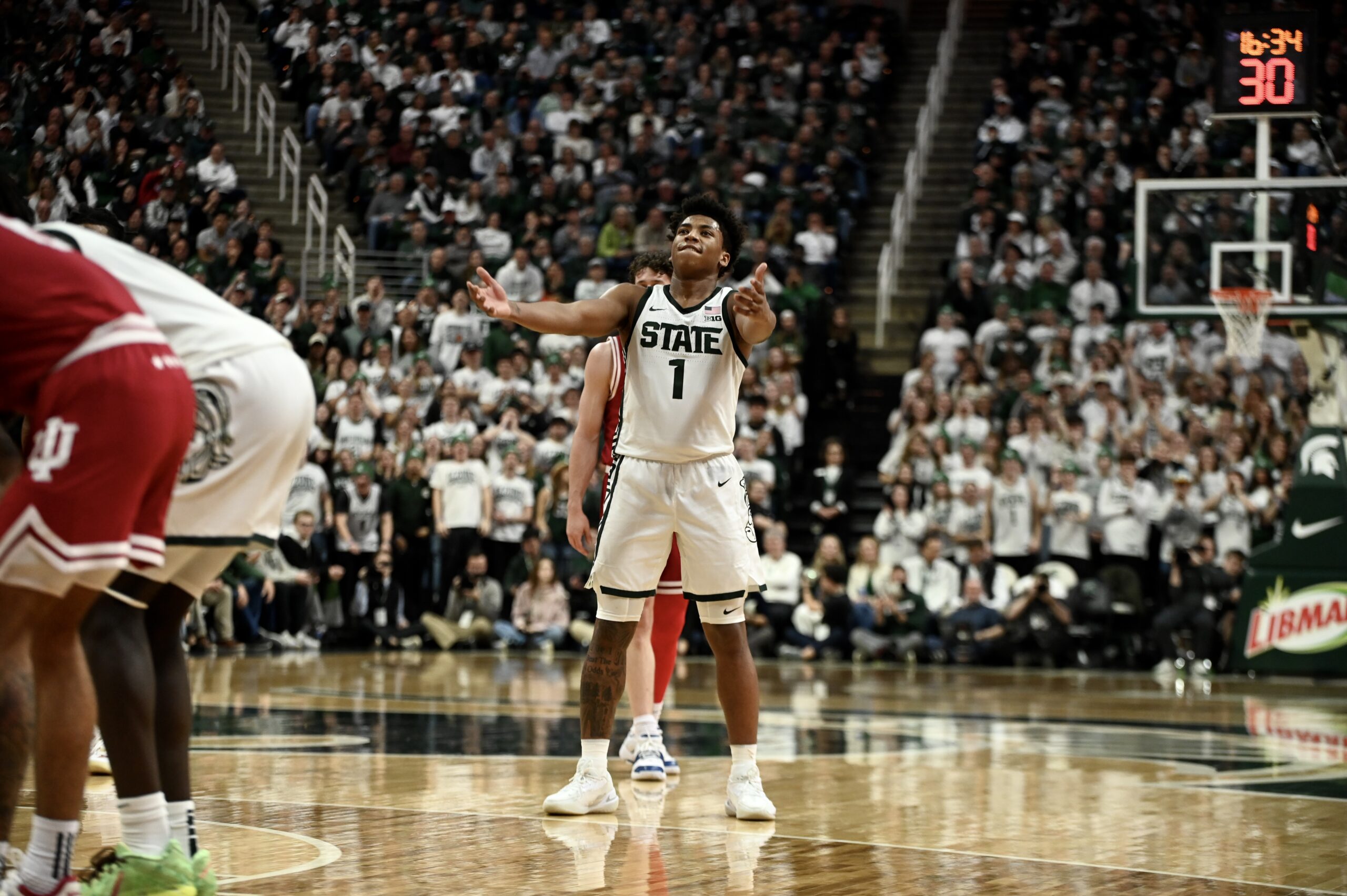 Jeremy Fears Jr. pumps up the Breslin Center crowd after IU misses a free throw.