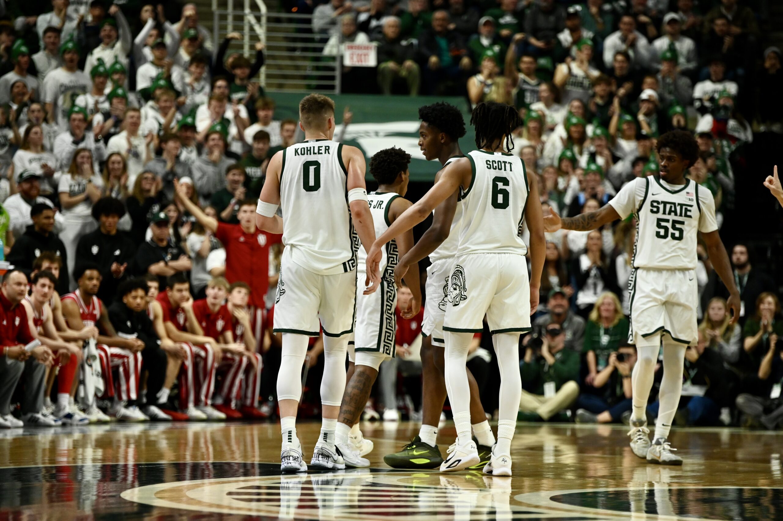 Jaxon Kohler (0) and Jordan Scott (6) are among the Spartans circled up against IU.
