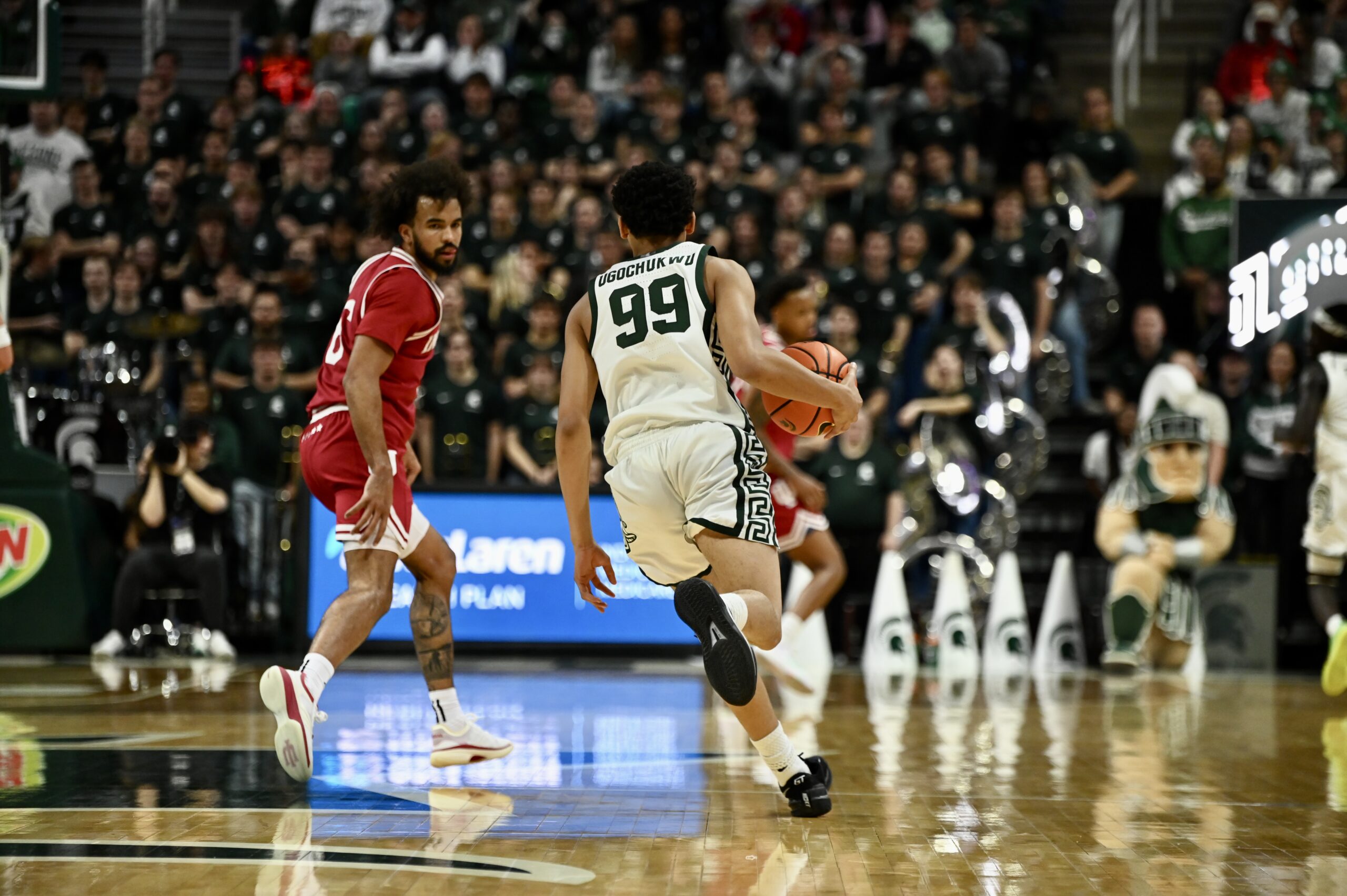 Divine Ugochukwu dribbles the ball up the court for Michigan State basketball.