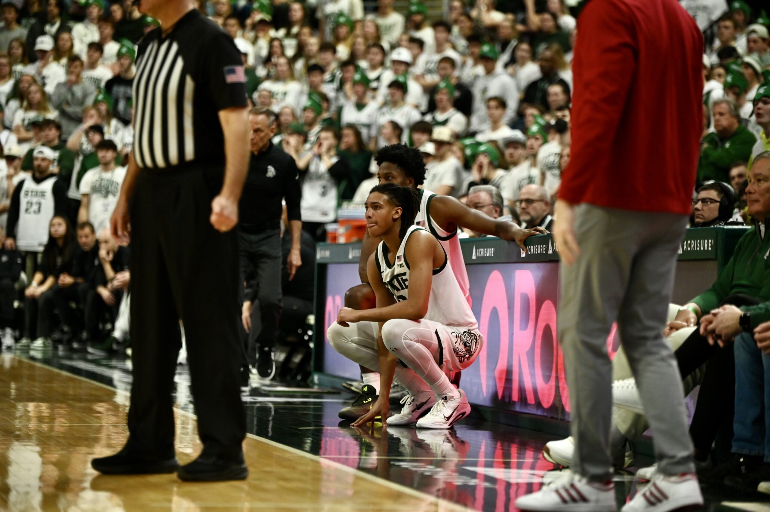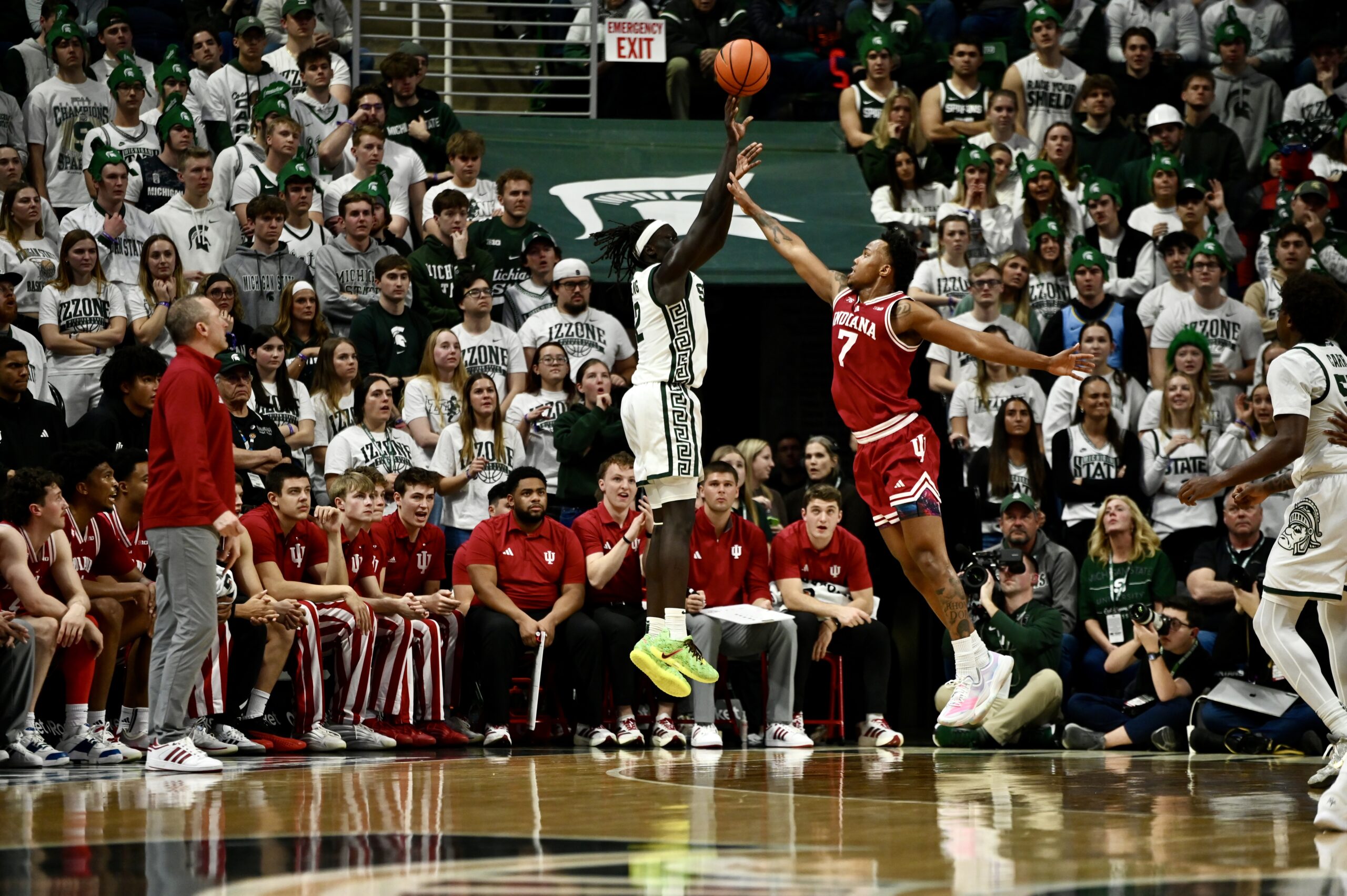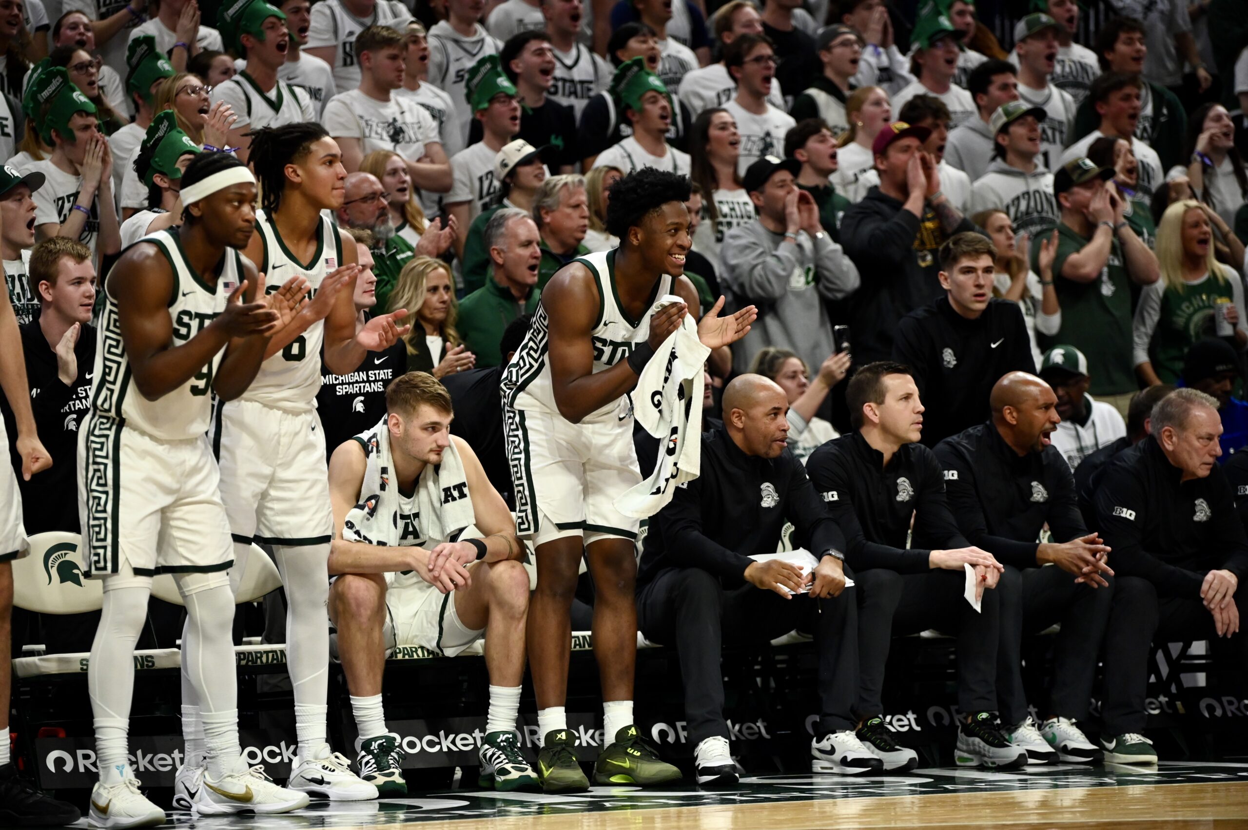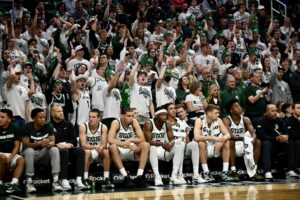 The Spartan bench sits while the Izzone erupts in “airball” chants to heckle Indiana during the second half of Michigan State basketball’s 81-60 win over IU.