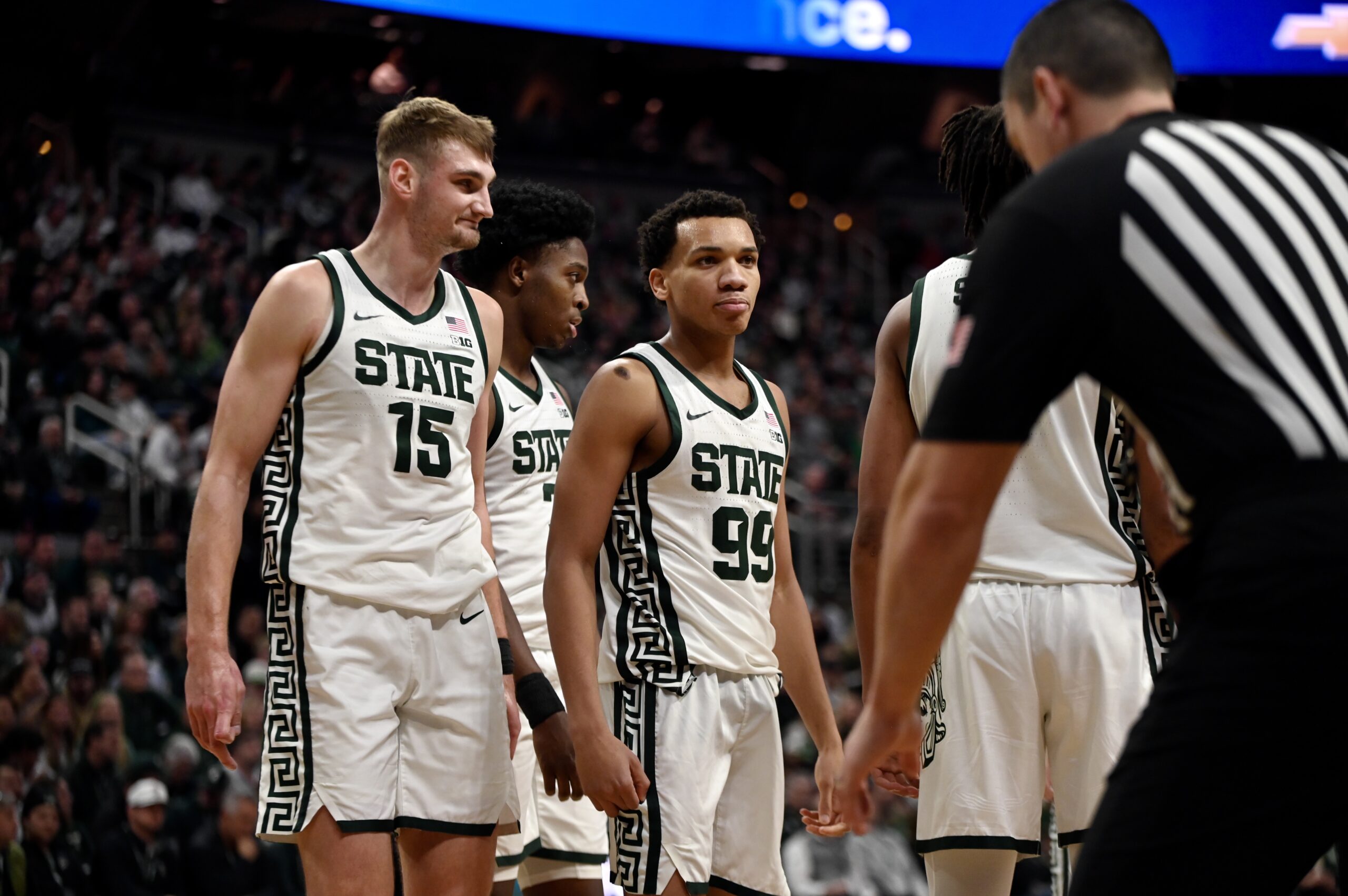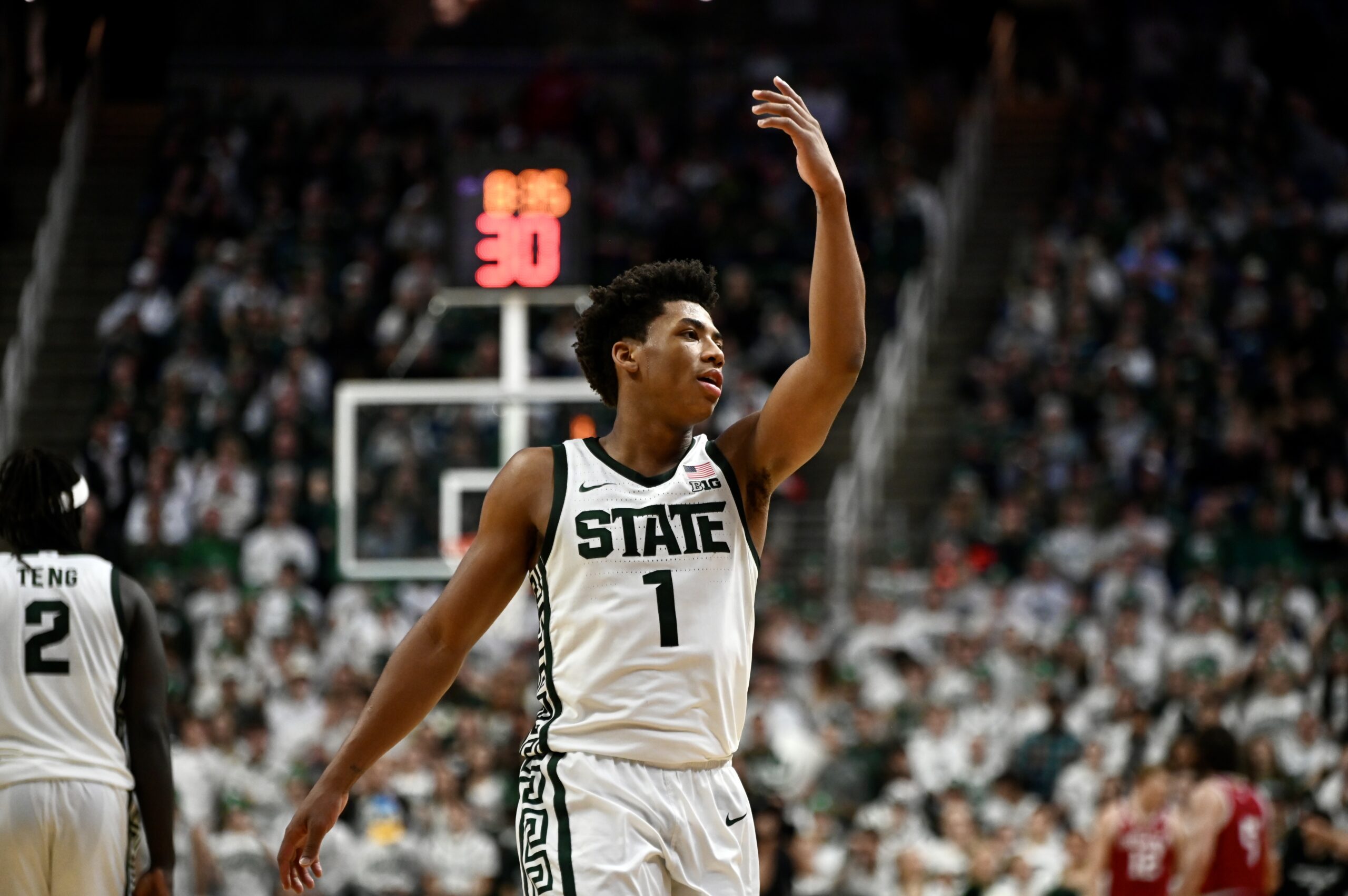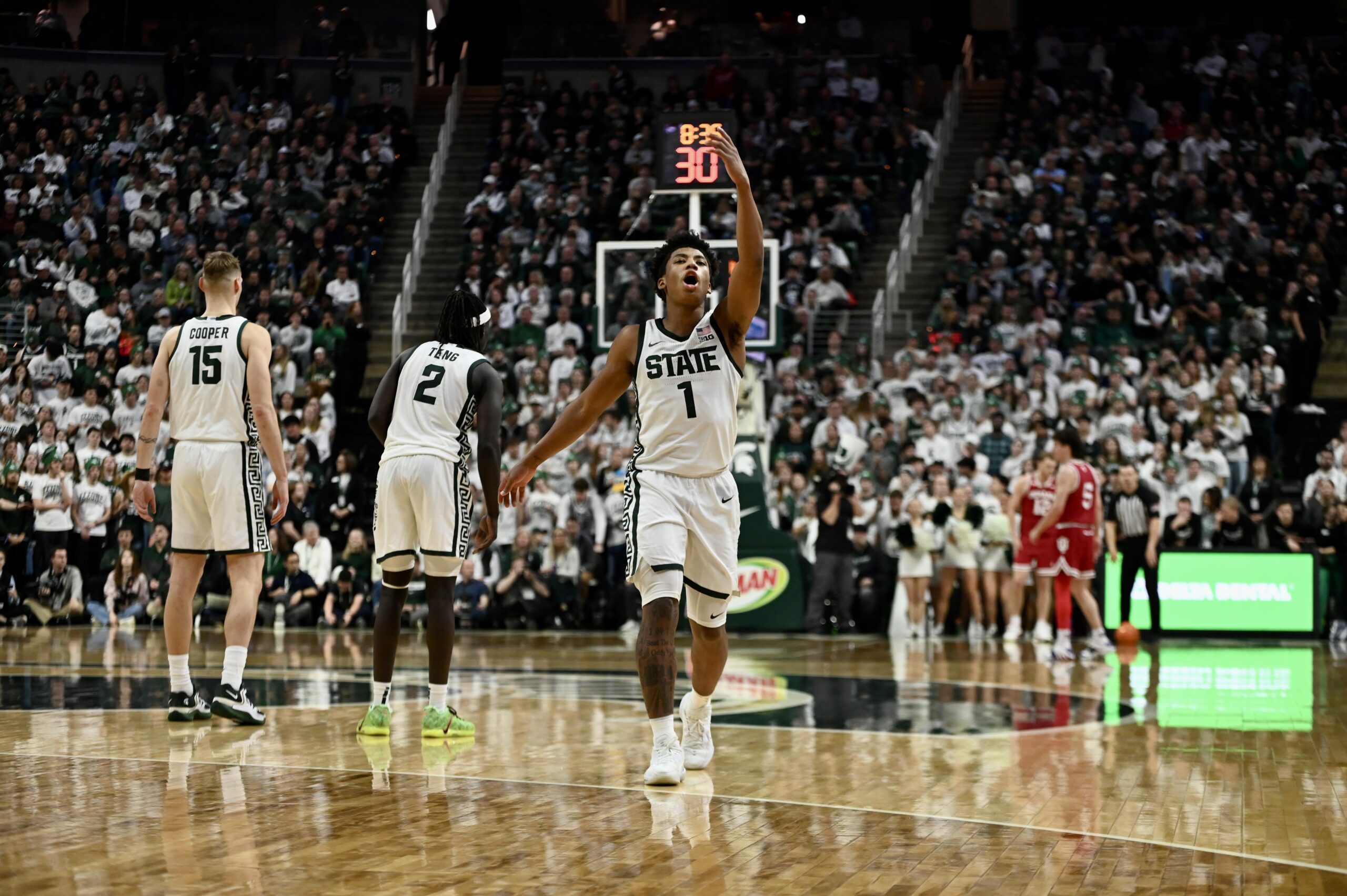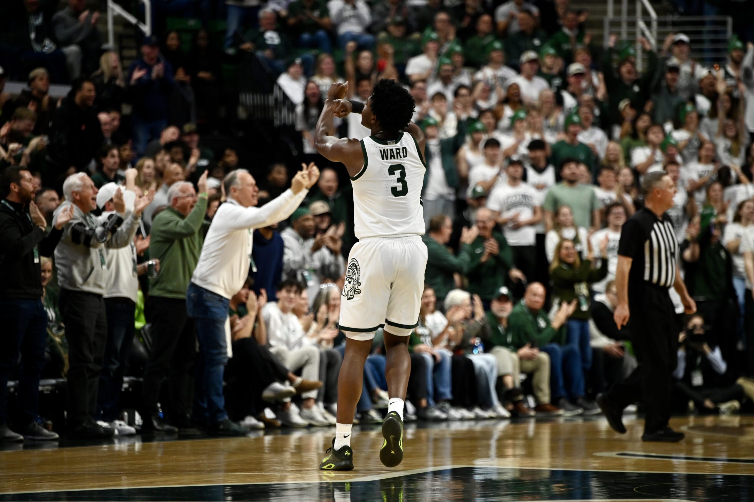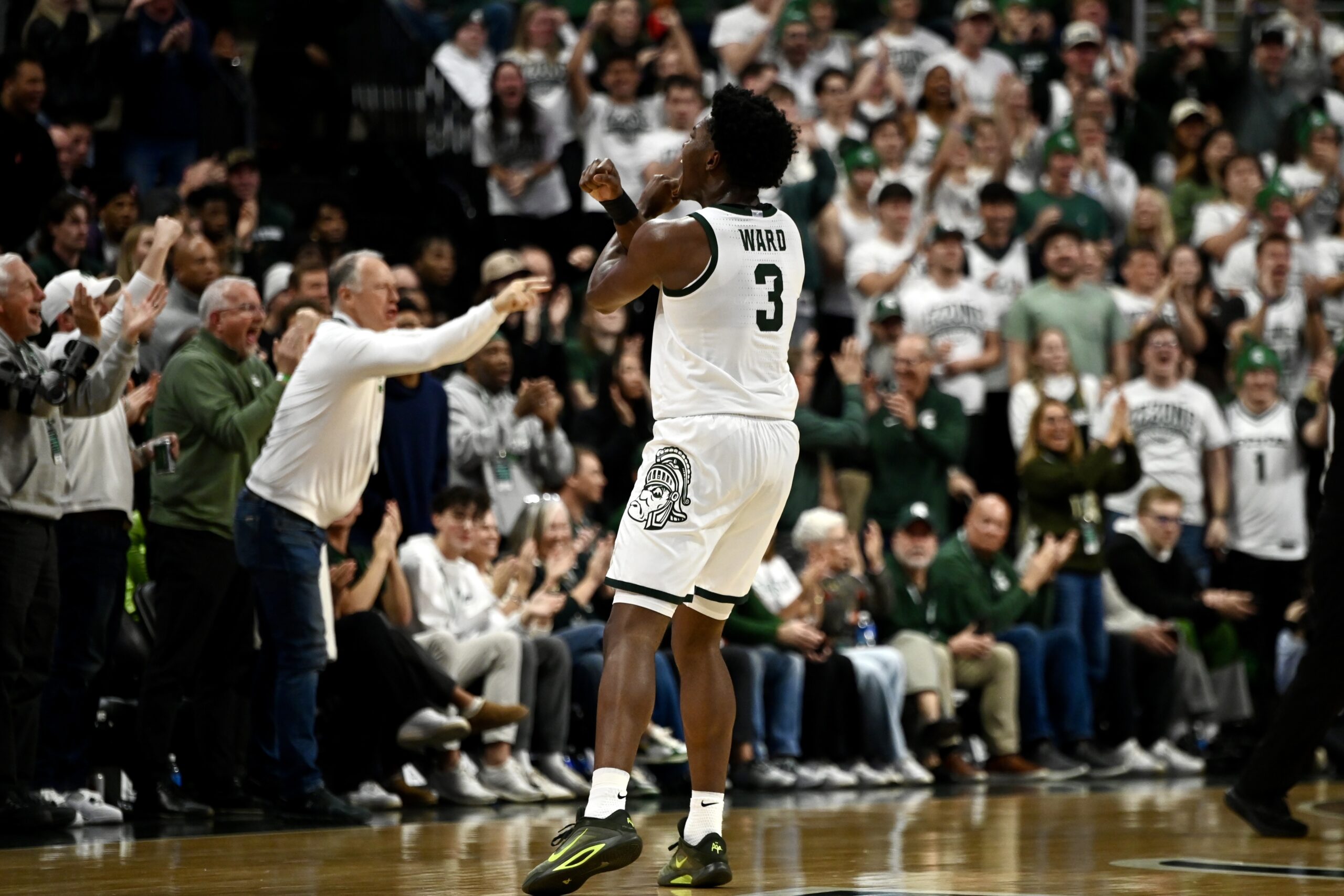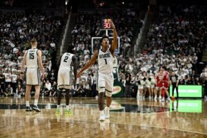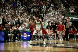 Cam Ward throwing up the “X” during a defensive run for Michigan State basketball.