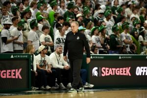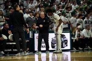 Tom Izzo walks up the court during Michigan State basketball’s win over Indiana.