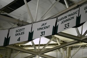 A view of Jay Vincent’s number in the Breslin Center rafters.