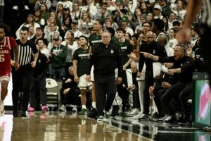 Tom Izzo gestures emphatically to his team.