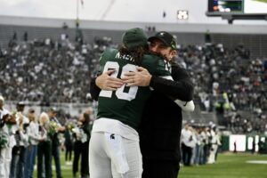 Jonathan Smith and Terry Smith shake hands following Michigan State football’s 28-10 loss.