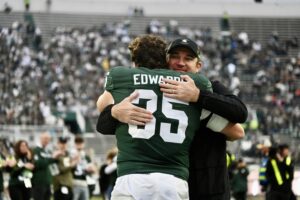 Sam Edwards embraces Michigan State coach Jonathan Smith.
