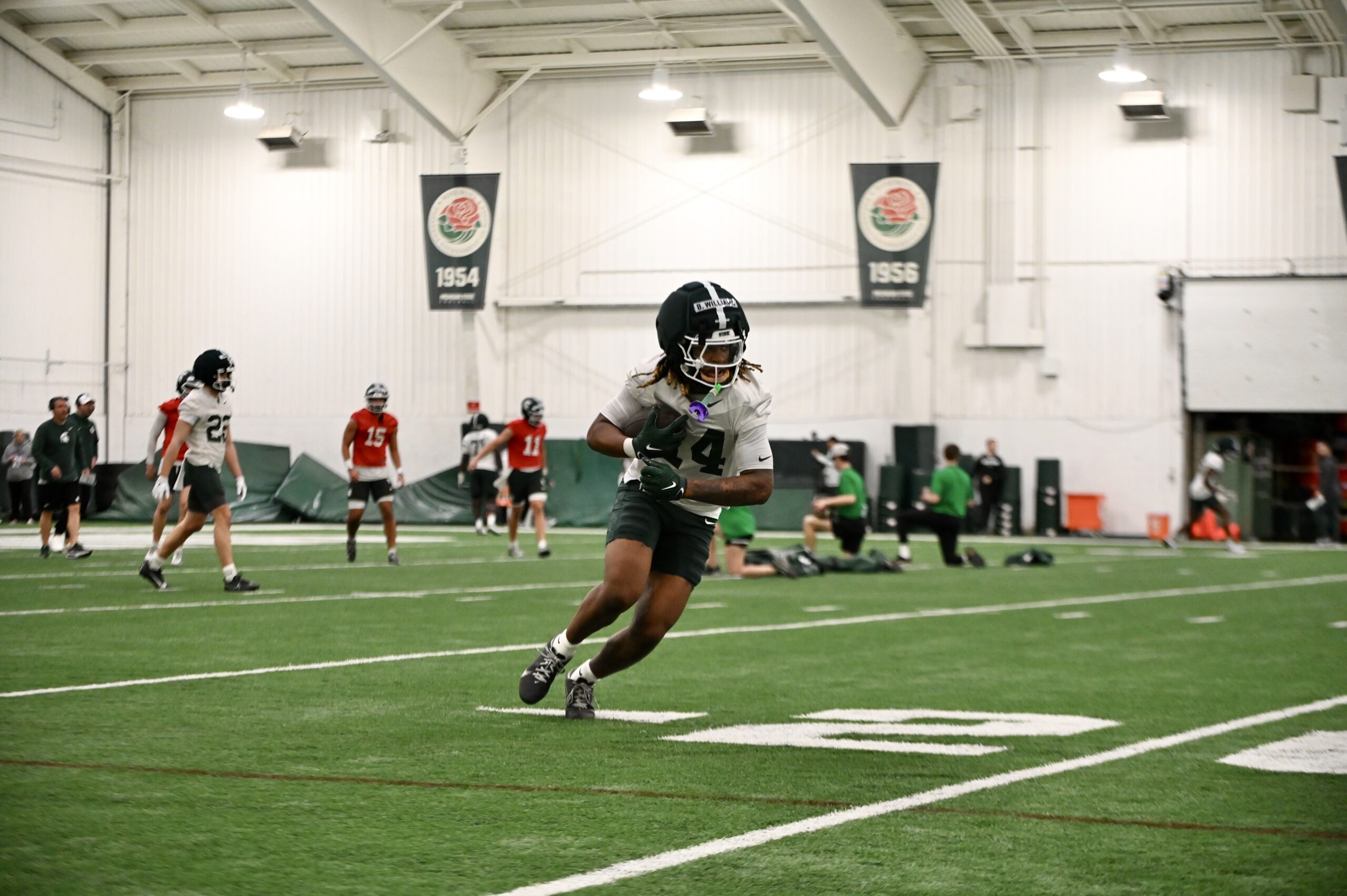 Rai’Shawn Elmore carries the football during his first spring practice with Michigan State football.
